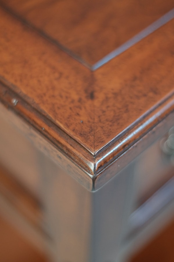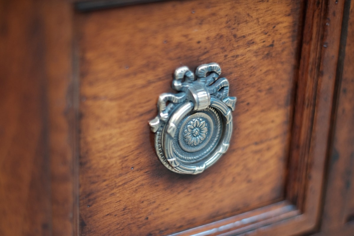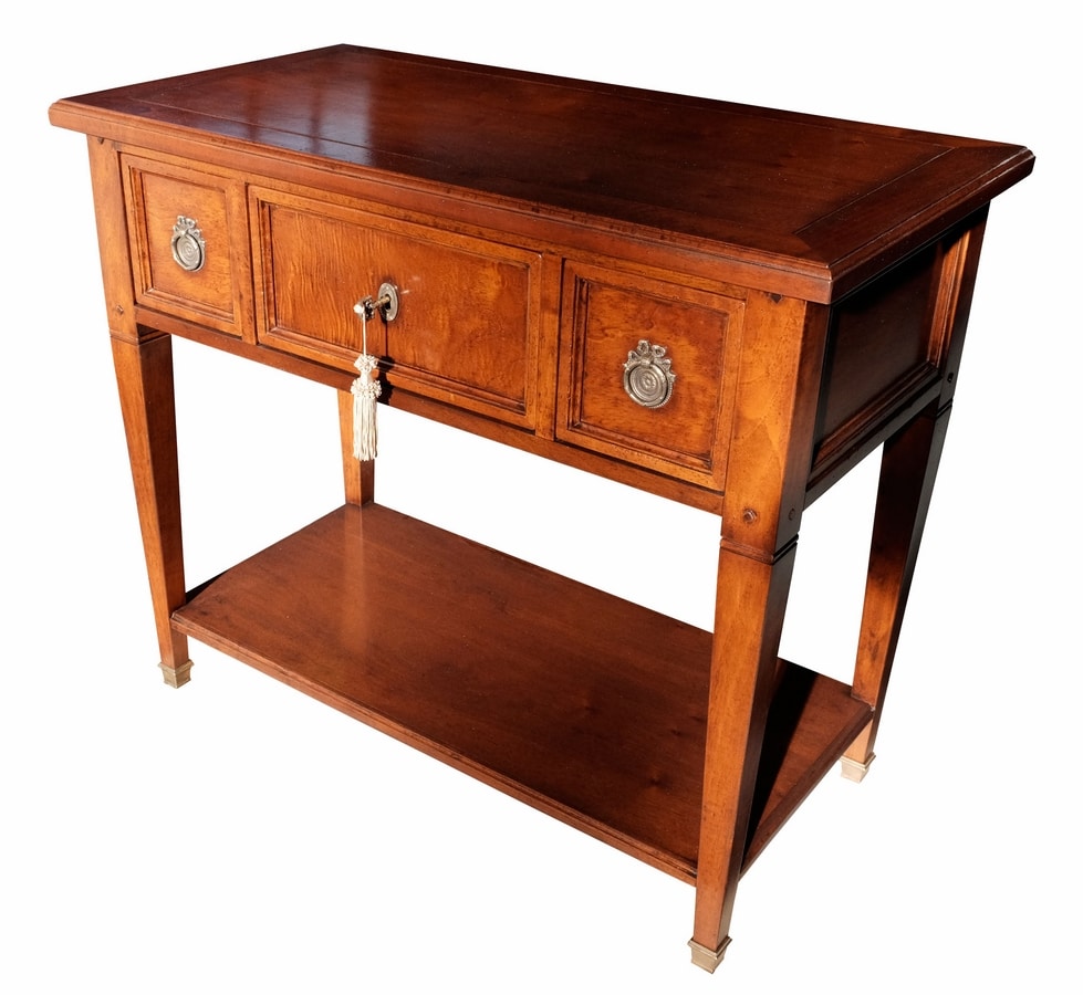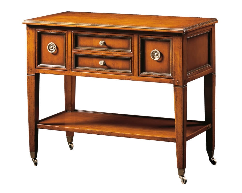 Mueble TV en nogal con dos pequeños cajones en el centro y dos a los lados. Paneles frontales y laterales enmarcados. Patas cónicas con tachuelas y repisa inferior rectangular. Ruedas de latón.