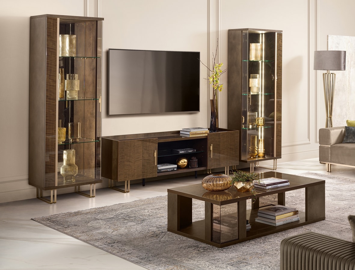 Solicitar precios Productos similaresRealzando aún más el valor de la colección están los elementos de vidrio bronceado que distinguen los buffets y vitrinas.