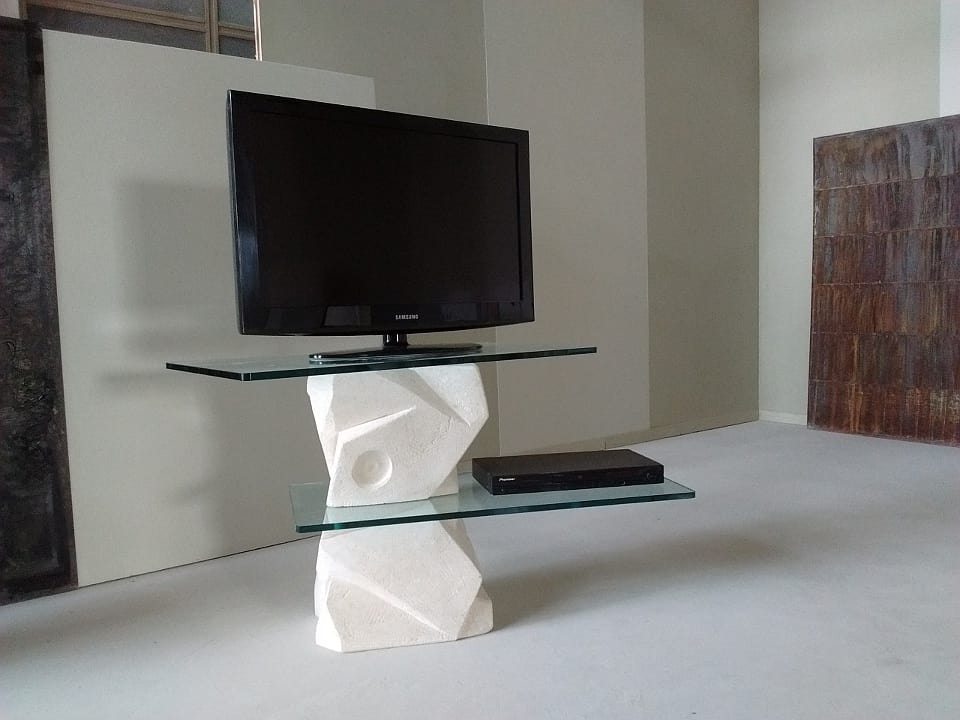 Soporte de TV moderno. Base en piedra natural esculpida y tops ajustables.