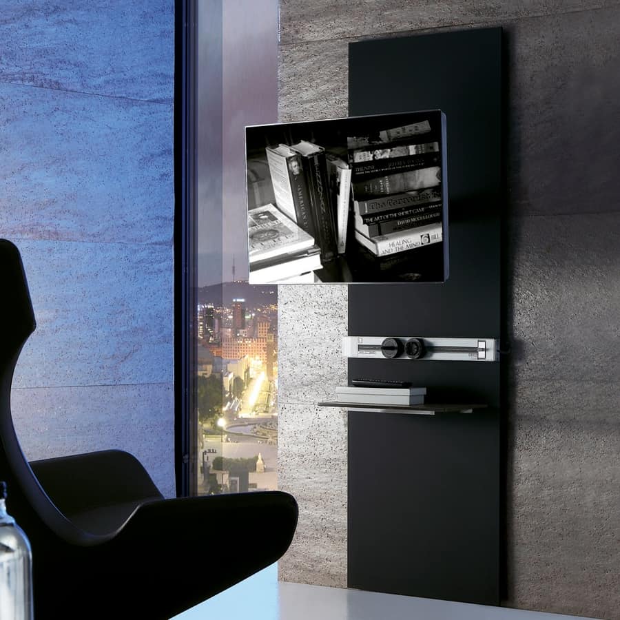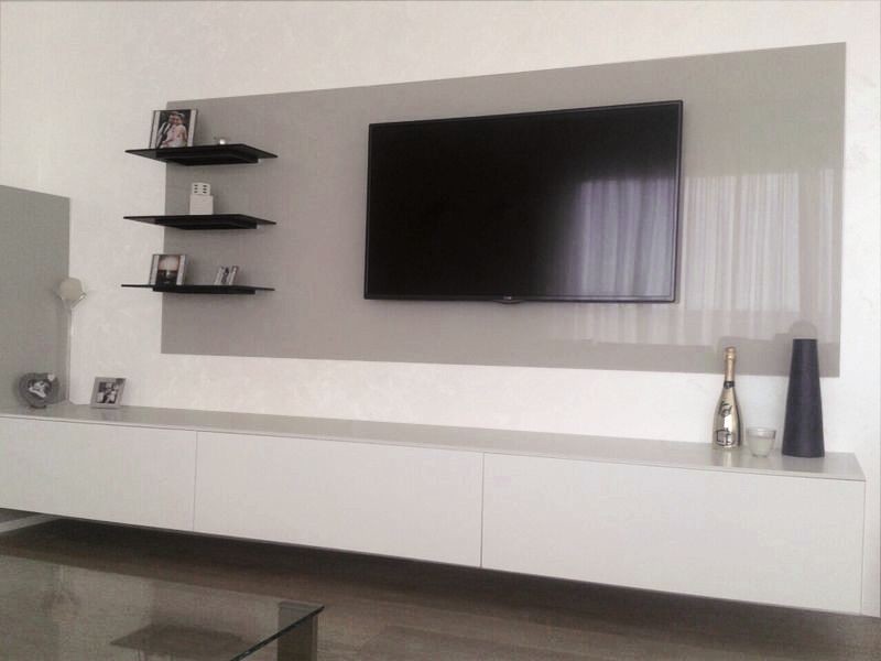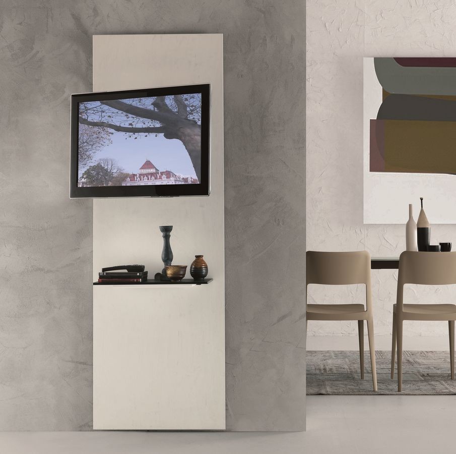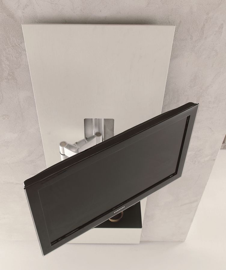 Templado cat.D color / E de 8 mm de espesor unidad de televisión de cristal. Panel posterior de espesor 20 mm melamina con soportes ajustables para la fijación a la pared y con superficie central para cables pasaje. Central de soporte tv con fijación mural directo, extensible y orientable hasta 180 °. Vidrio coloreado gato. Estantes D / E.