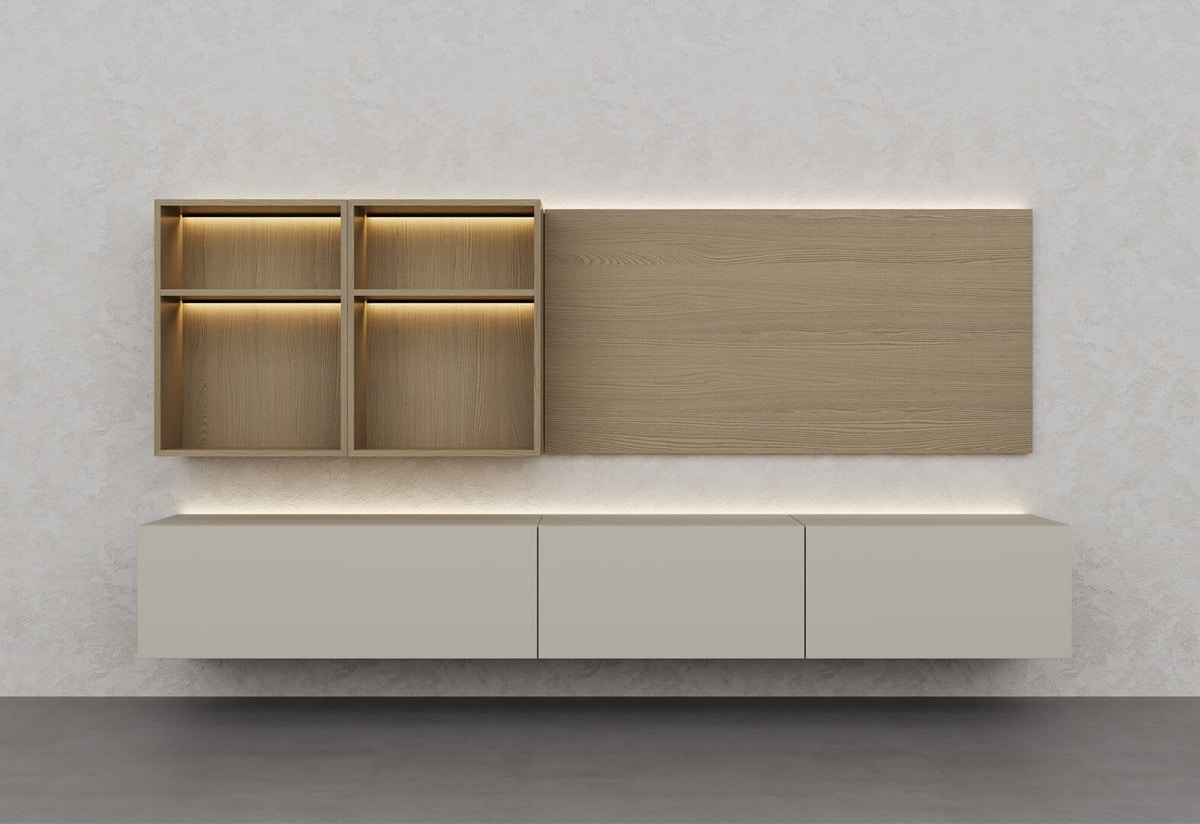 Solicitar precios Productos similaresMueble de pared para salón. Módulos con puertas abatibles y cajones lacados Creta. Módulos abiertos y panel TV en esencia de madera de Barrique.