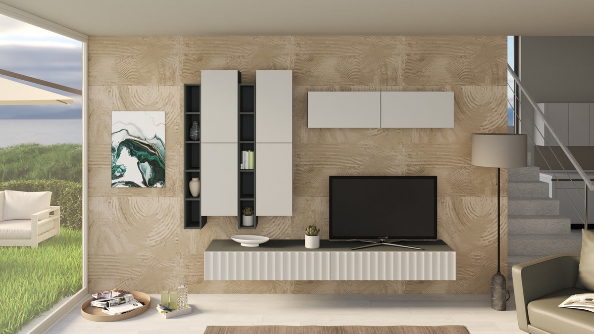El Marfil se posa sobre la Antracita con una claridad esencial, creando un contraste nítido y sofisticado. Las superficies estriadas introducen un ritmo táctil, mientras que los gabinetes flotantes aportan ligereza. Una pared que transforma la sencillez en un gesto elegante.