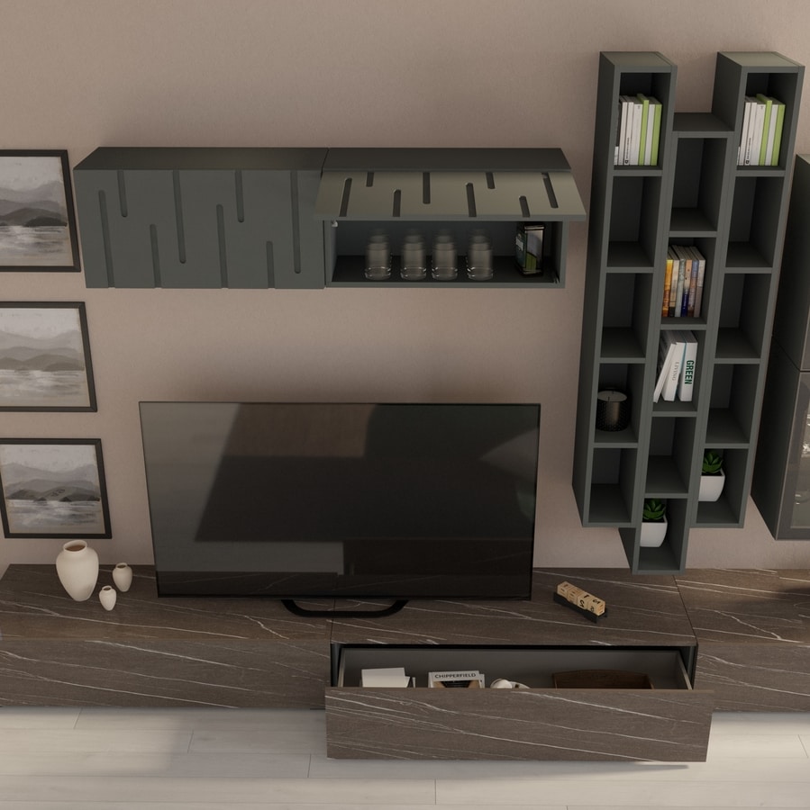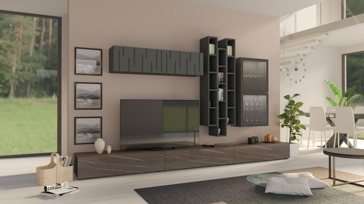 Pulpis Marble recorre la base como una antigua veta de tierra, trazando patrones naturales que se asemejan a grabados atemporales. La antracita texturizada constituye un contrapunto riguroso, mientras que las vitrinas de vidrio ahumado contienen suaves transparencias que amplifican la luz. Un muro que celebra el contraste: sólido pero ligero, íntimo pero teatral.