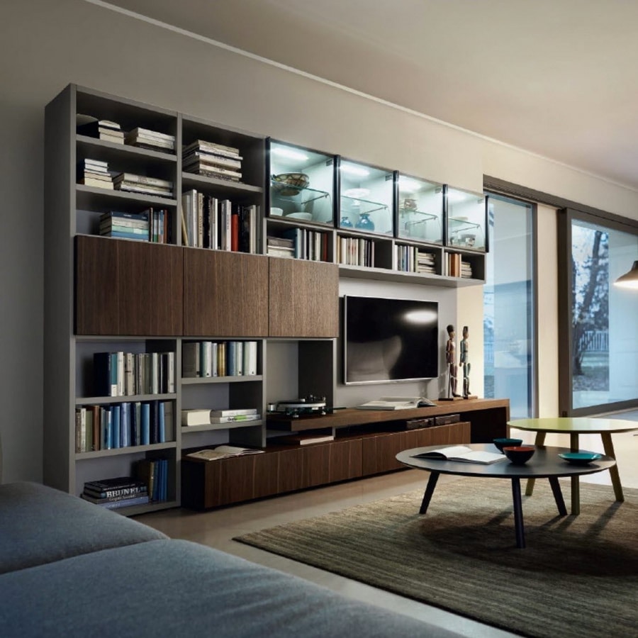 - Unidad de TV con sistema de plegado con acabado de laca de pizarra mate y unidades de almacenamiento de piso LAMPO con paneles frontales de 35 mm de espesor y 60 mm de espesor con diseño en C y chapa de roble tratada térmicamente