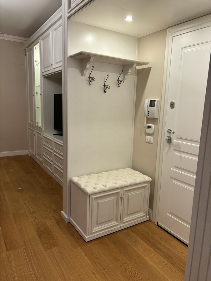 Un proyecto diseñado para optimizar espacios y crear continuidad visual entre la zona de estar y la entrada, transformando una pared en un completo sistema multifuncional.