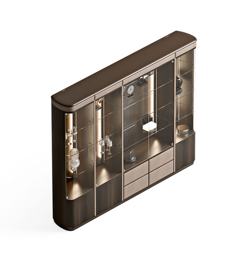 Cajones: madera. Frentes en esencia o lacados con la posibilidad de cubierta de cuero o tela. Madera interna cubierta de microfibra y abertura con un sistema de empuje.