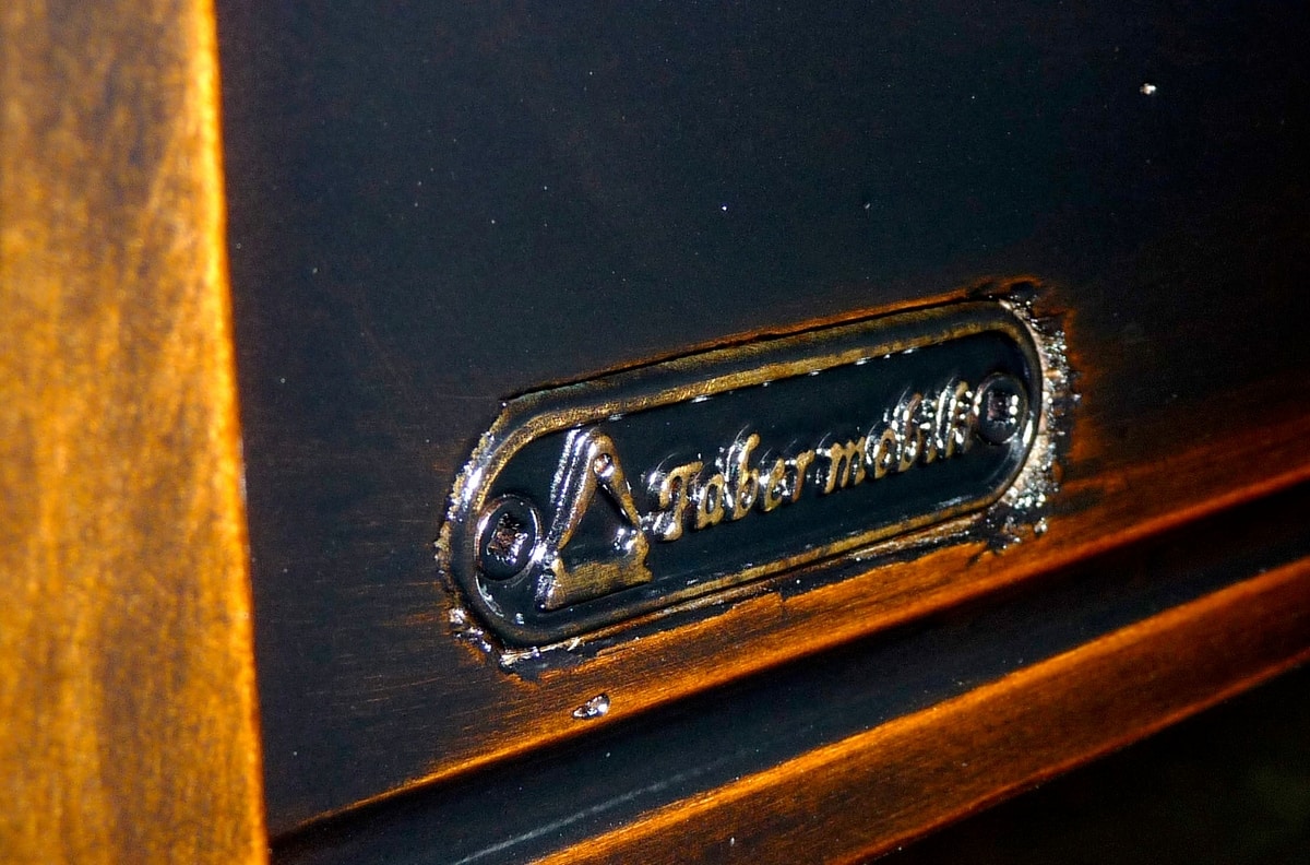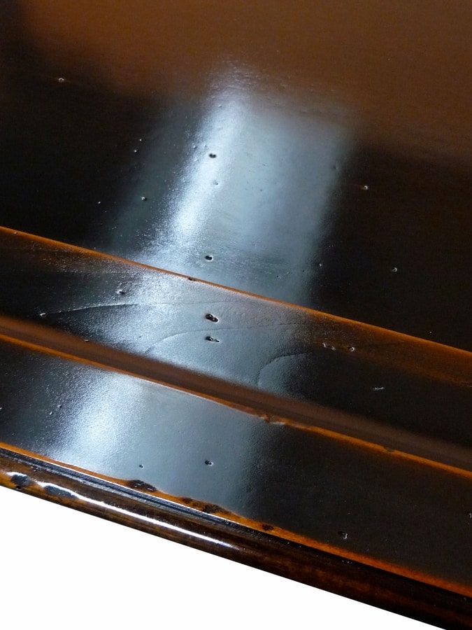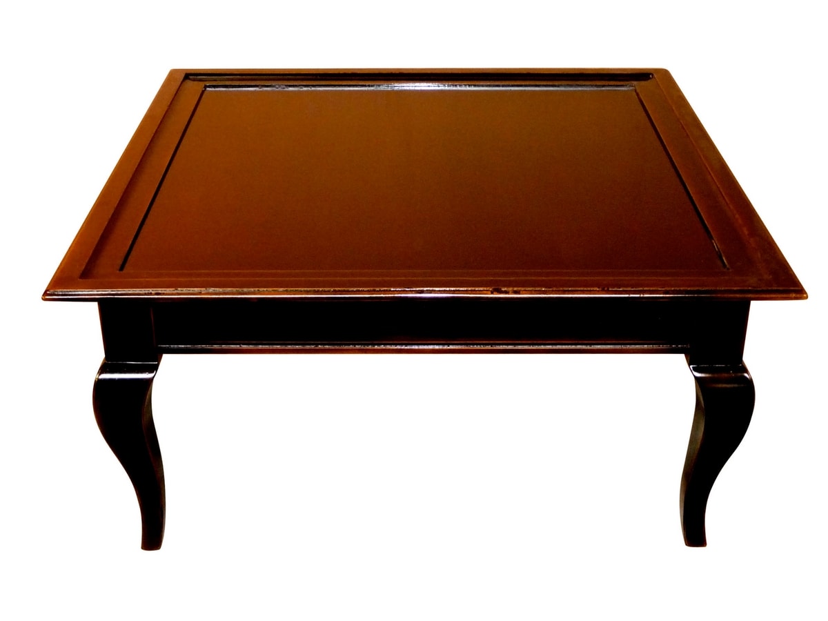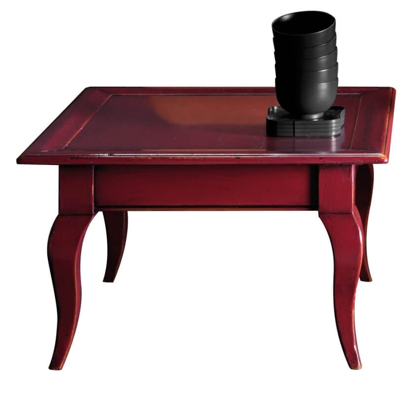 Mesa de centro con tapa de bandeja de madera y patas de sable. En la foto, madera teñida y lacada en rojo (código: Rosso Faber) con desgaste normal.