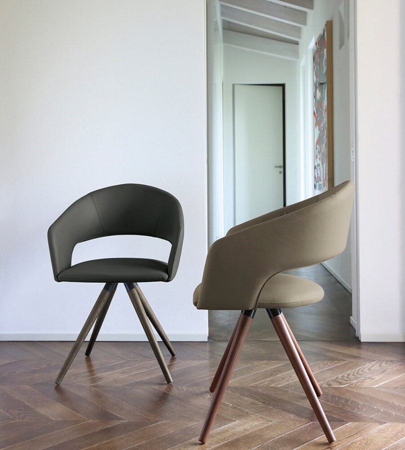 Silla, estructura de acero recubierta de cuero, cuero, tela o cuero sintético. Las patas son de madera maciza torneada lacada.