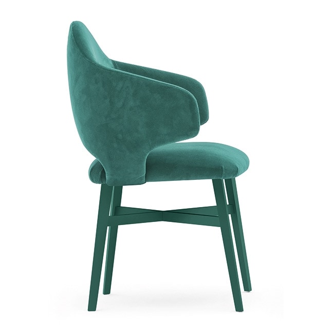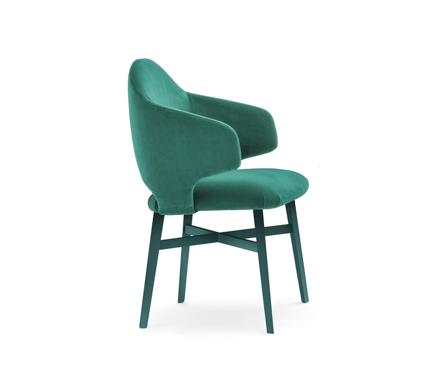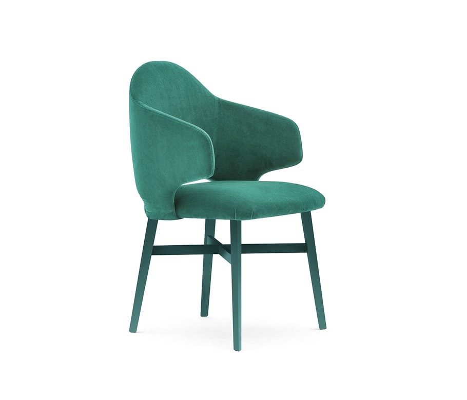 Sillón de madera con respaldo y asiento de madera contrachapada. Tapizado en el marco con 4 patas de madera maciza de haya.