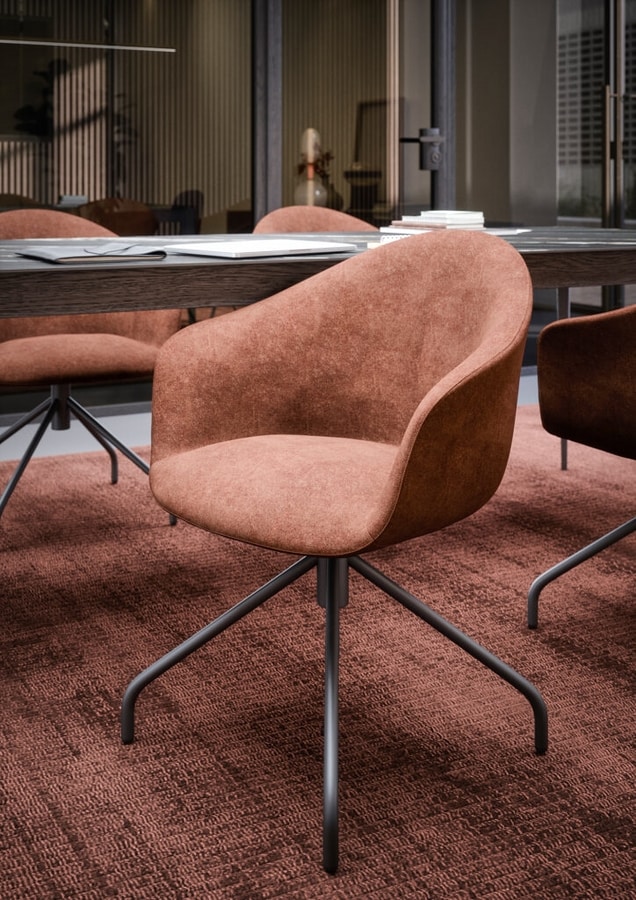 Hacia abajo es una silla refinada y minimalista, en una exquisita tensión entre el rígido metal o madera de las patas ahusadas y la envolvente suavidad del conjunto asiento – respaldo – brazos.