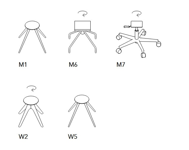 Cuerpo moldeado en poliuretano flexible con inserto metálico, con cinco soluciones diferentes para la base (metal o madera, fija o giratoria).