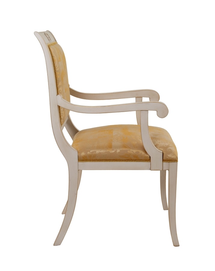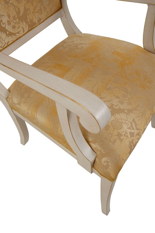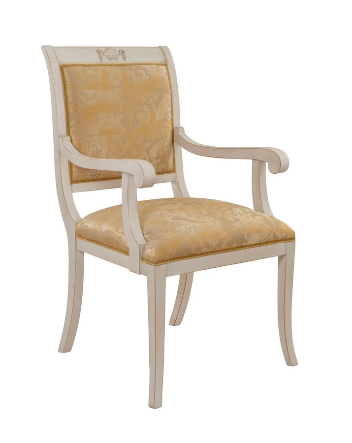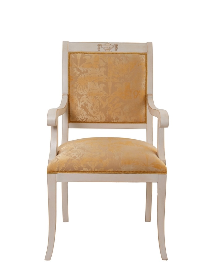 Silla con brazos en madera tallada, tapizada en tela, acabado lacado LAFM cepillado temple francés blanco merengue con base pan de oro.