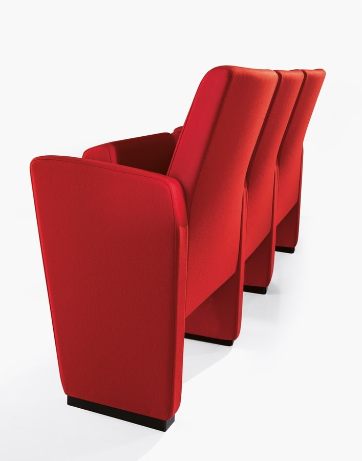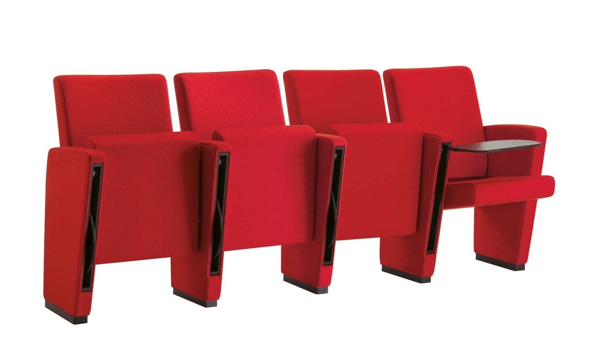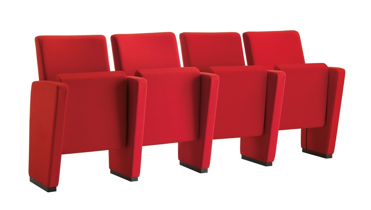 Silla de conferencia modular con reposabrazos lateral completamente tapizada en el piso El asiento es muy cómodo gracias al tamaño generoso y el acolchado correcto. De diseño simple y lineal, se adapta perfectamente a cualquier entorno. Sin embargo, pueden variar según los requisitos de diseño precisos. Están disponibles las versiones con escritorio (plegables en el lateral) y también la versión con escritorio plegable en la parte posterior del respaldo.