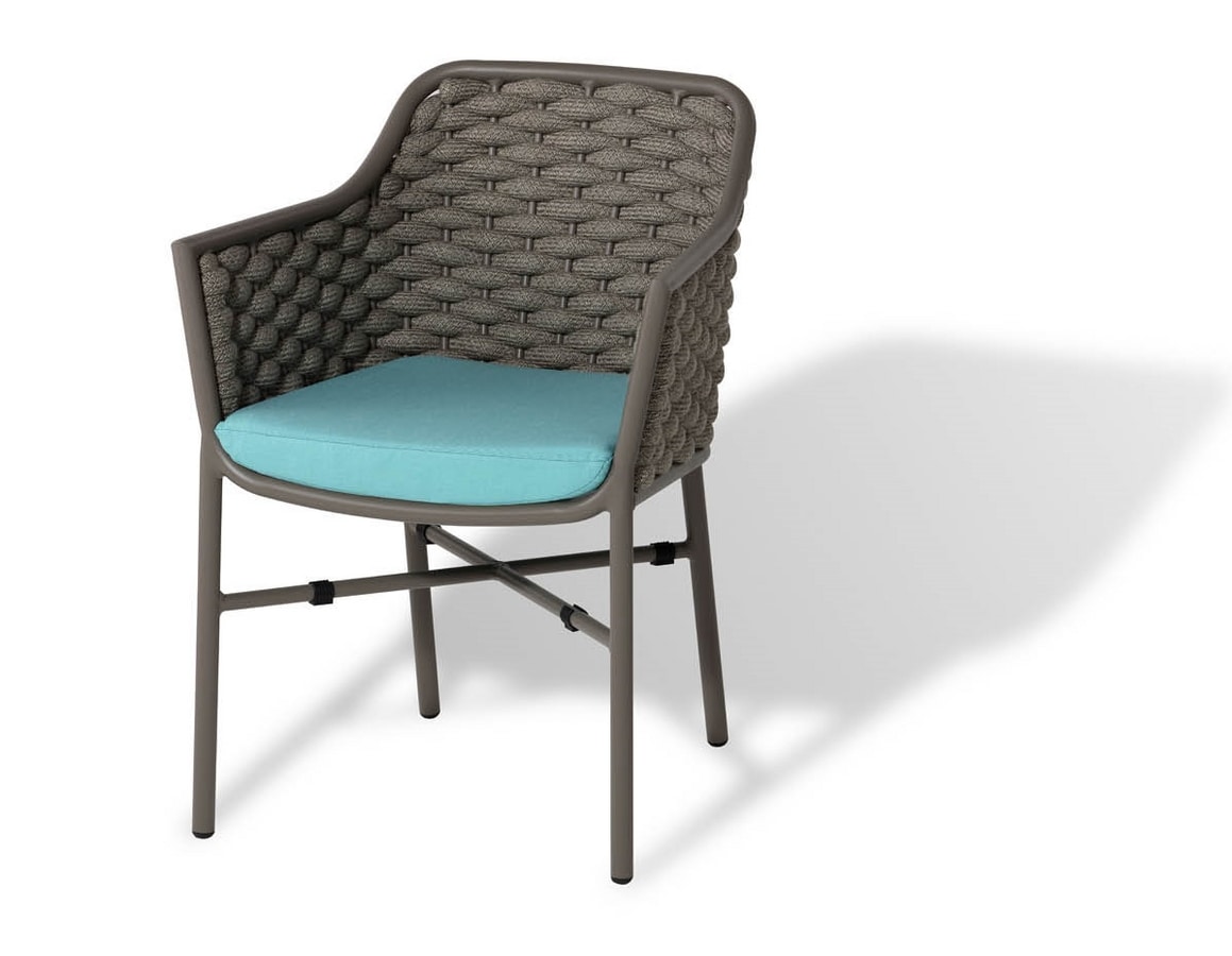 Sillón apilable en aluminio con revestimiento de textileno o tejido de poliéster y caucho. Cojines en tejido acrílico.