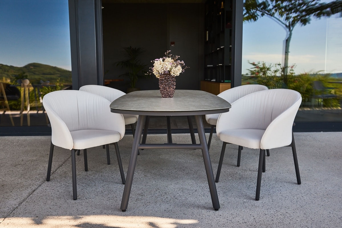 Acogedor, suave y con un sabor retro, este sillón de aluminio también está disponible en versión silla. El revestimiento de secado rápido garantiza una resistencia total a la intemperie.