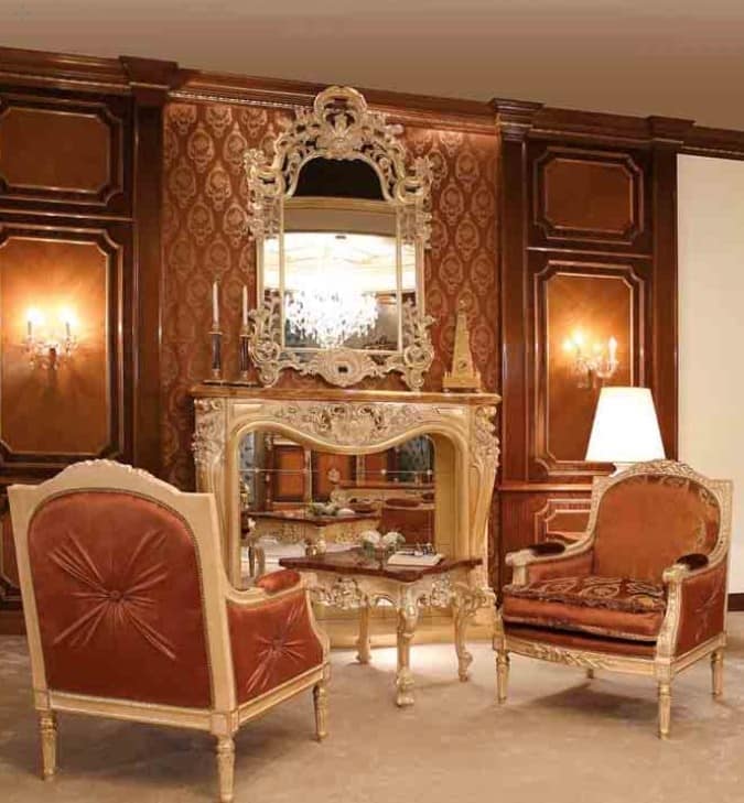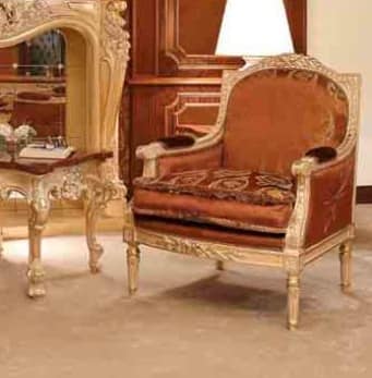 Sillón de estilo clásico, con marco de madera tapizado con telas preciosas. Las tallas que caracterizan este modelo se hacen a mano.