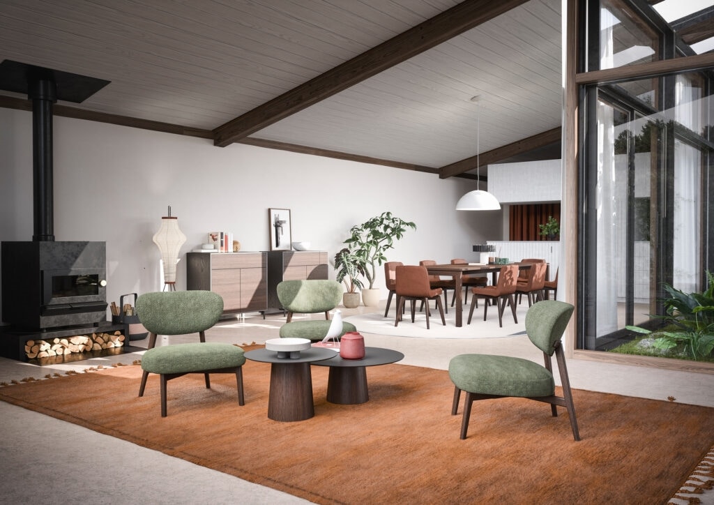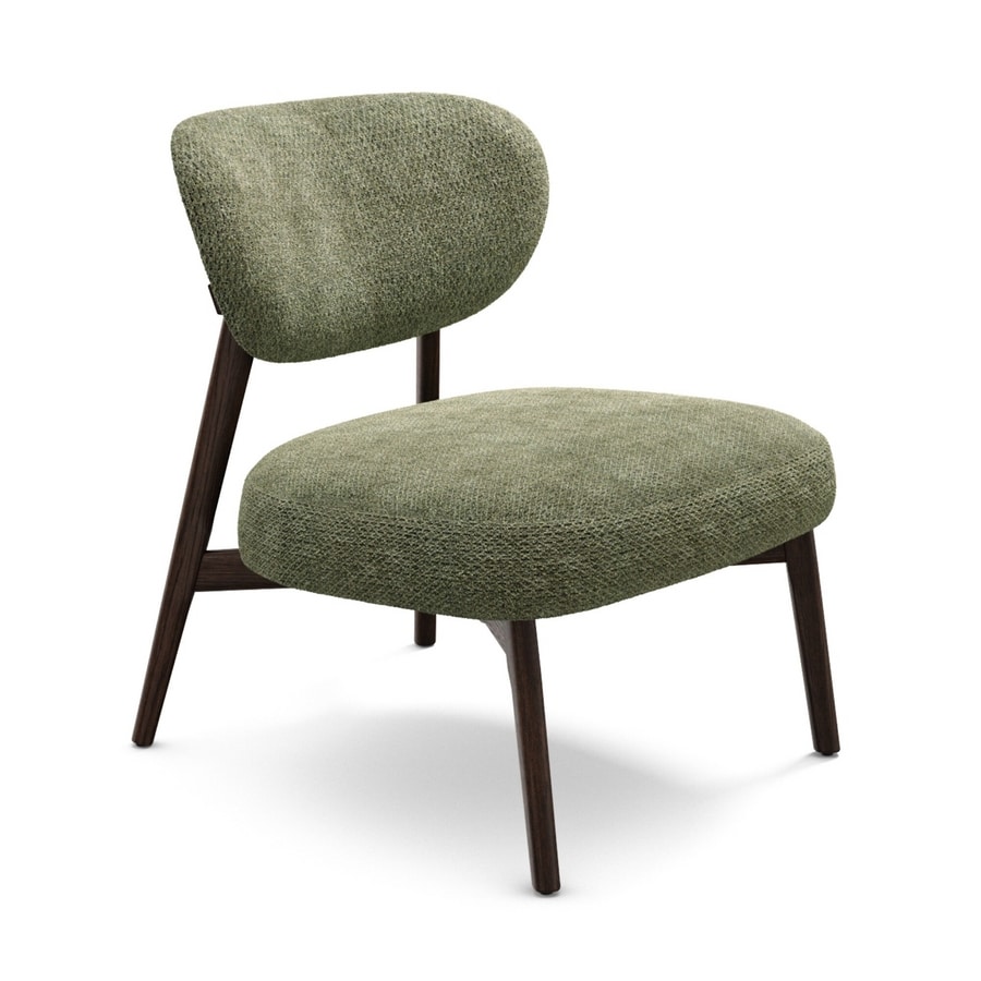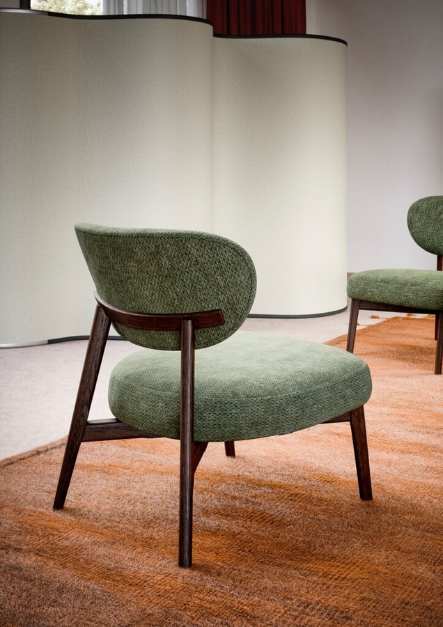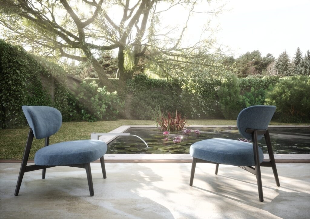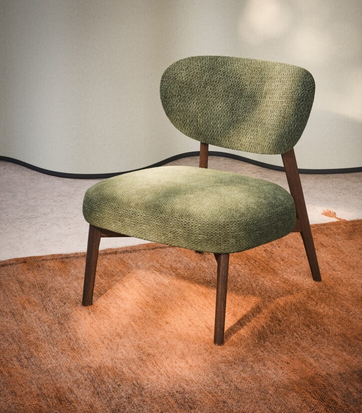 Almo Lounge está compuesto por una estructura de madera maciza con respaldo envolvente y asiento acolchado con espuma de poliuretano.