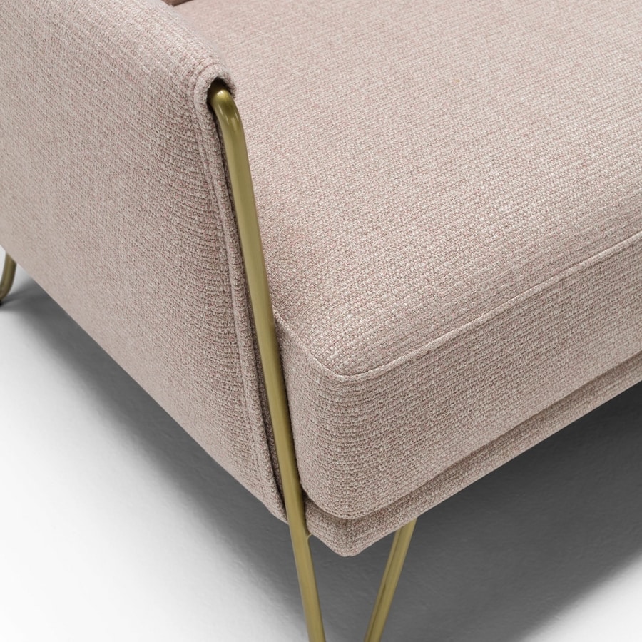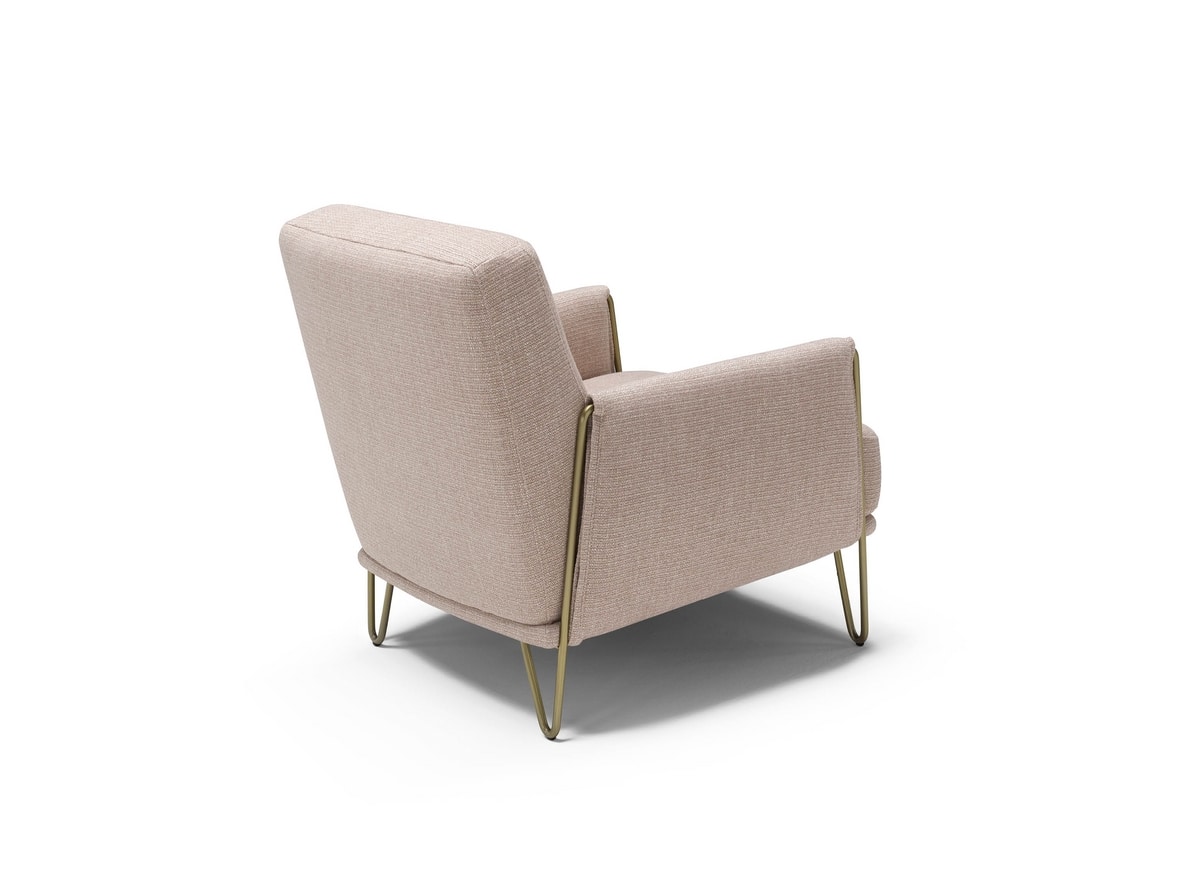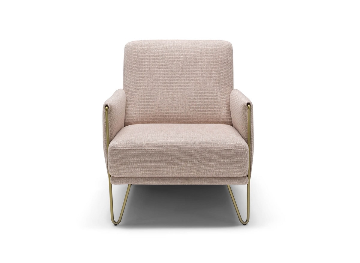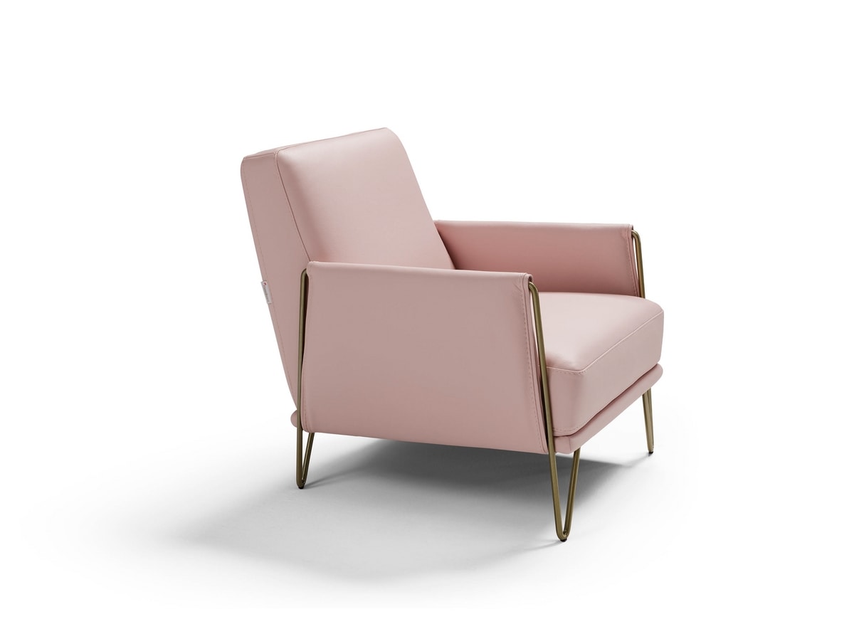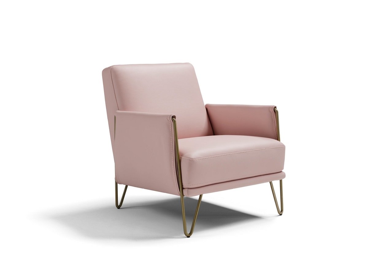 Sillón moderno con acolchado de espuma de poliuretano, tapizado en piel o tela. Pies metálicos. Marco de madera.