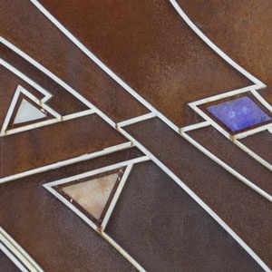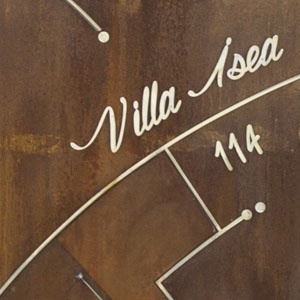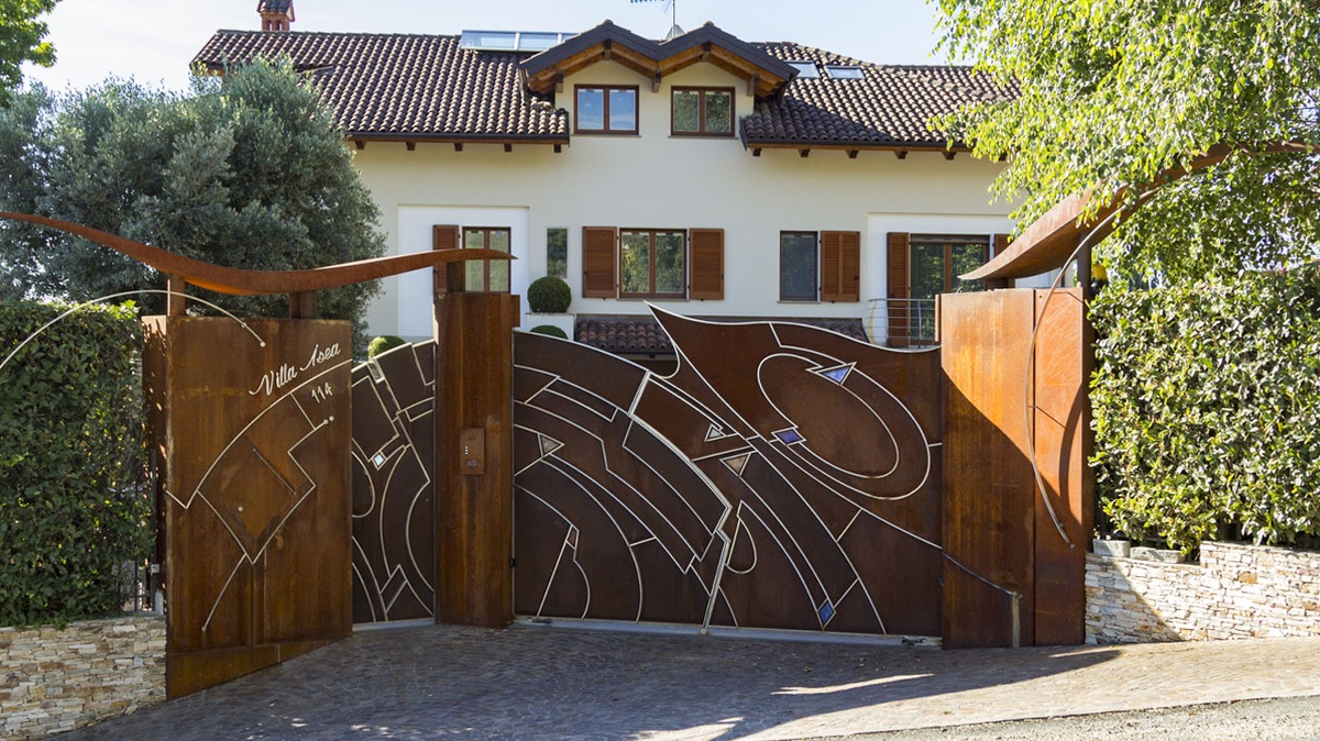 Puerta de entrada y la puerta peatonal, hecha de marco de acero inoxidable con forma, con taponamiento en acero corten con inserciones en vidrio fundido, refugios fabricados hechos de acero corten, pilares y paredes laterales completamente cubiertas de acero corten, todos en el diseño de artista Elio Garis.