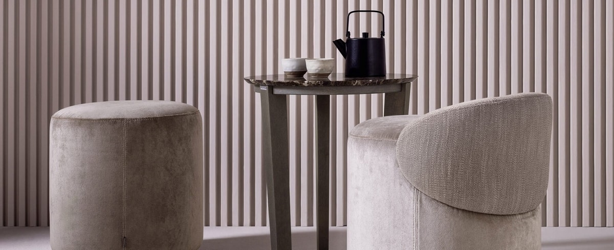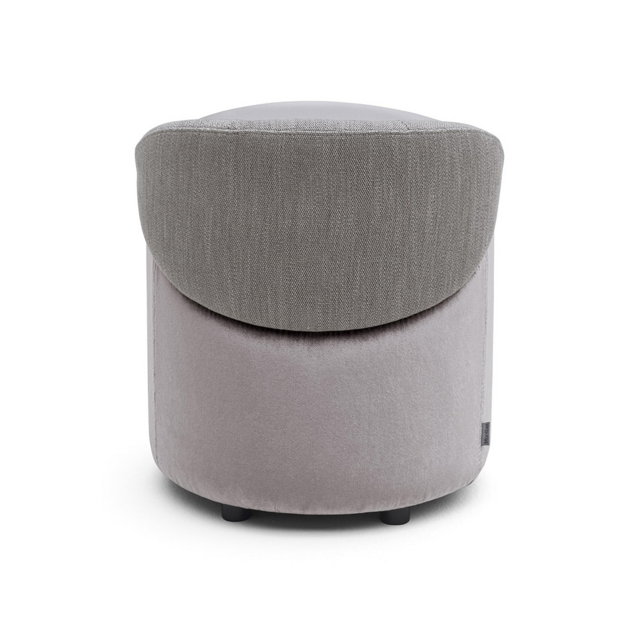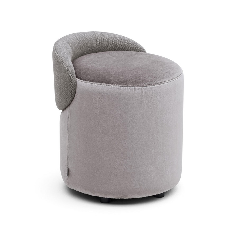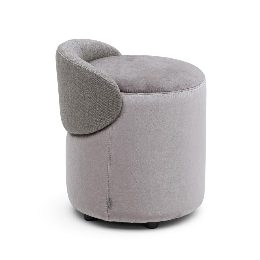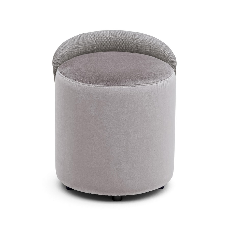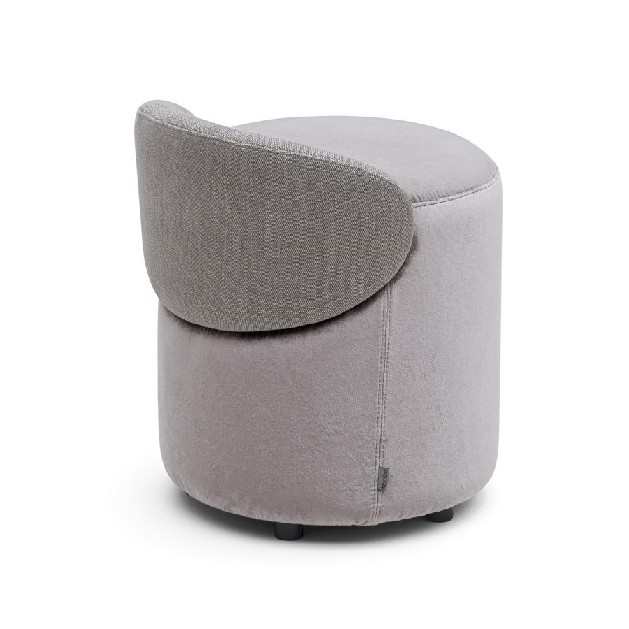 Tapizado otomano redondo con respaldo corto. Se deslizan de plástico negro.