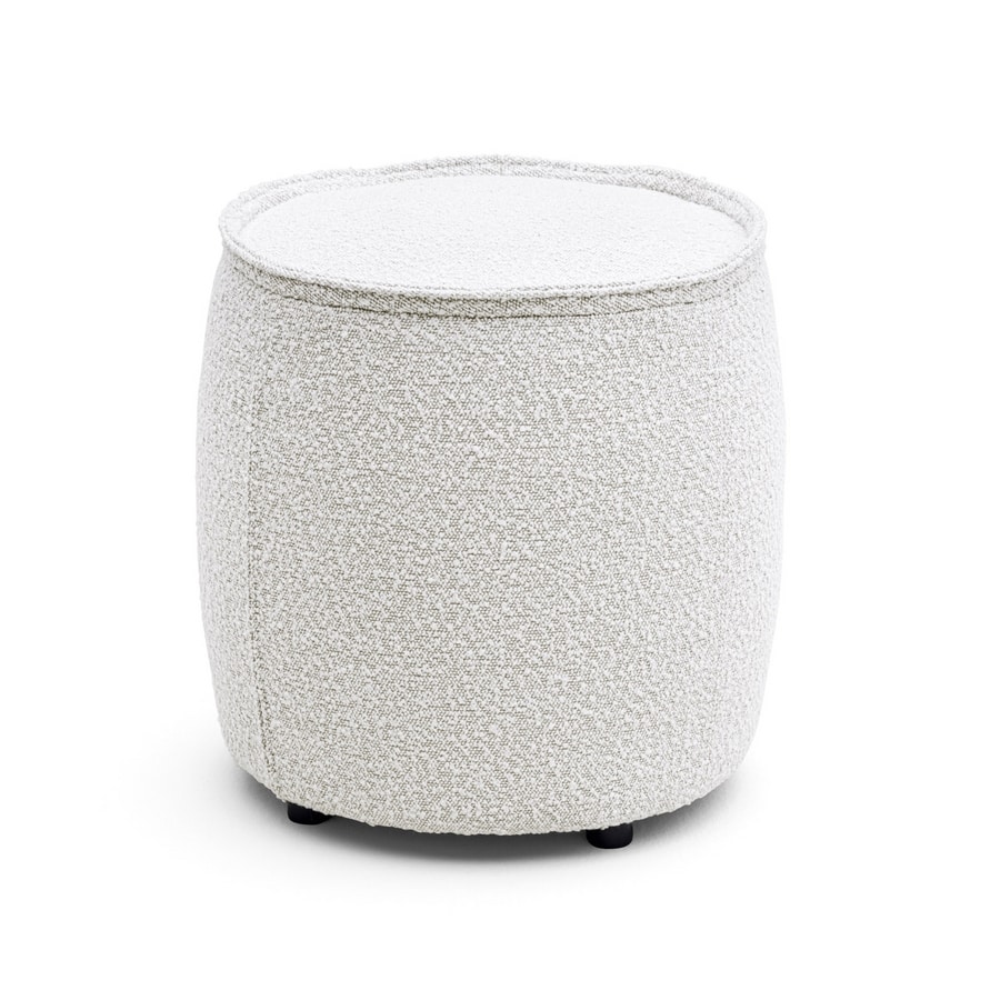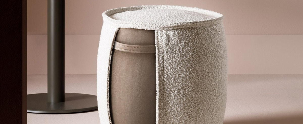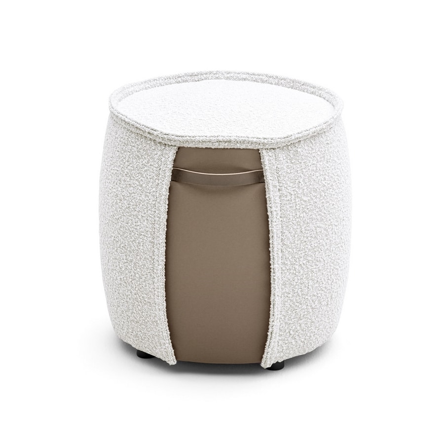 Otomana redonda con tela o inserto de cuero en el costado, con tela o mango de cuero. Bordes superpuestos especiales en el borde superior del asiento y en el inserto. Con pies de plástico negro.