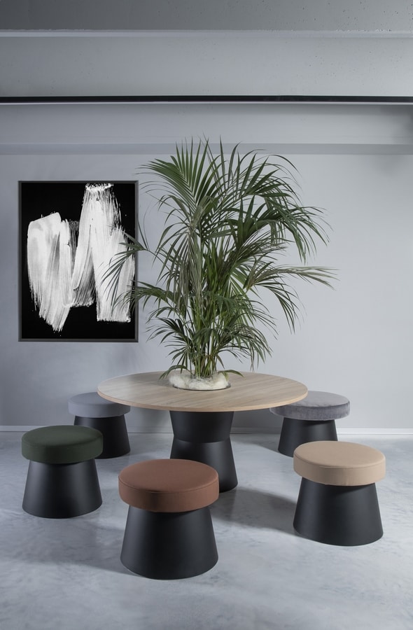 Salt combina geometrías simples, funcionalidad y versatilidad: la colección incluye pufs y bancos con base cónica en tecnopolímero, combinados con asientos acolchados y revestidos, para ofrecer confort y estilo.