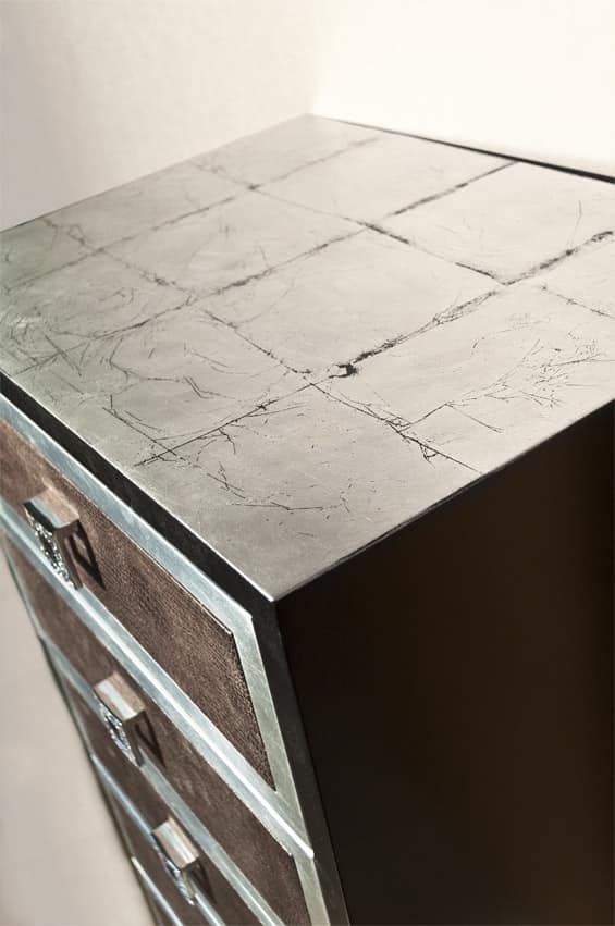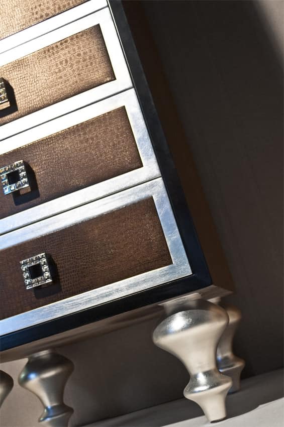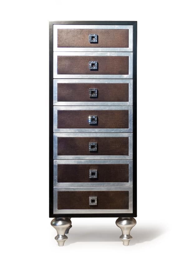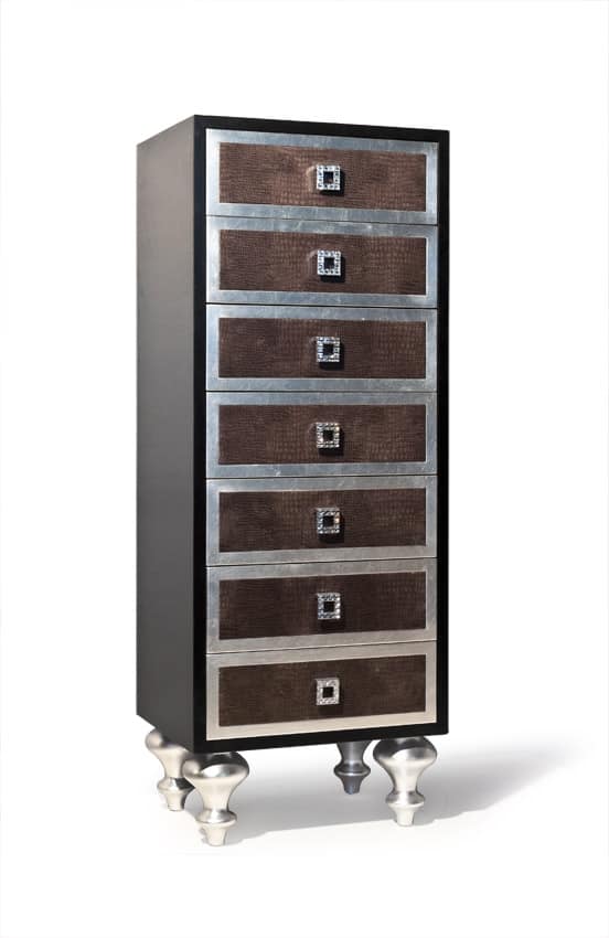 Cómoda en madera de haya. Acabado: hoja negra y plateada, cajones frontales cubiertos con estampado de cocodrilo de imitación cuero, mandos Swarovski.