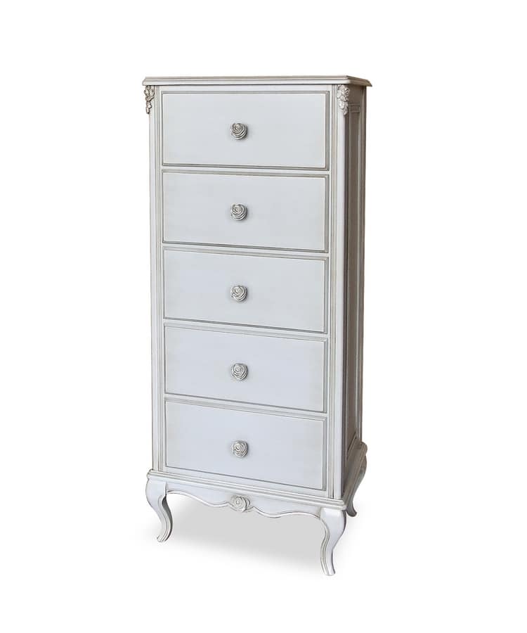Cómoda de madera de haya, acabado blanco angustiado. Estilo clásico con tallas hechas a mano. Equipado con 5 cajones.