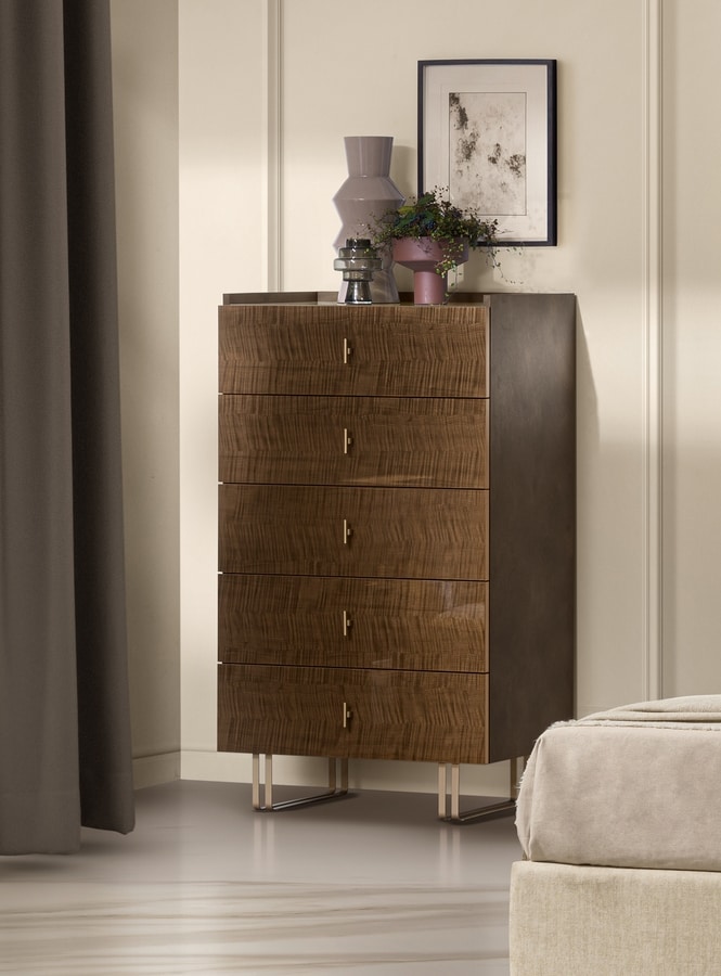 Las geometrías sobrias y limpias se ven realzadas por los acabados de nogal sicomoro de alto brillo que caracterizan las superficies, haciéndolas luminosas y profundas, y creando sofisticados juegos de reflejos.