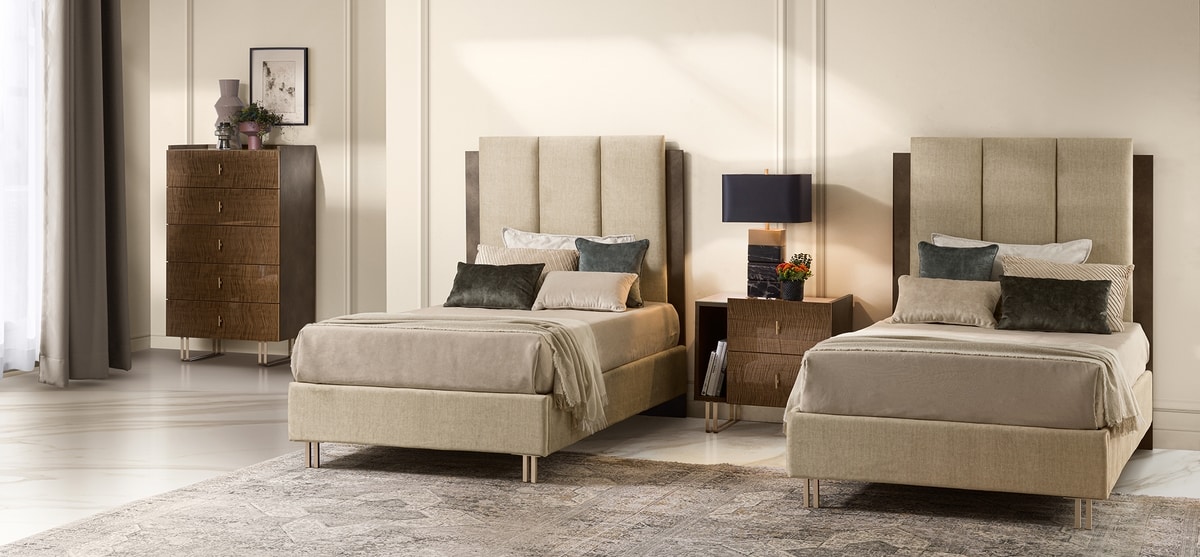 Solicitar precios Productos similaresEn la zona de noche Fiamma, el lenguaje de la colección se enriquece con nuevas sugerencias de materiales, destacando las encimeras de la cómoda y de las mesitas de noche en vidrio pintado con acabado Calacatta Gold.