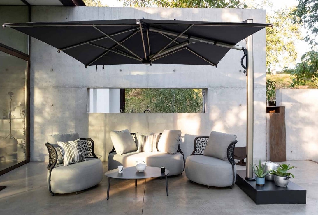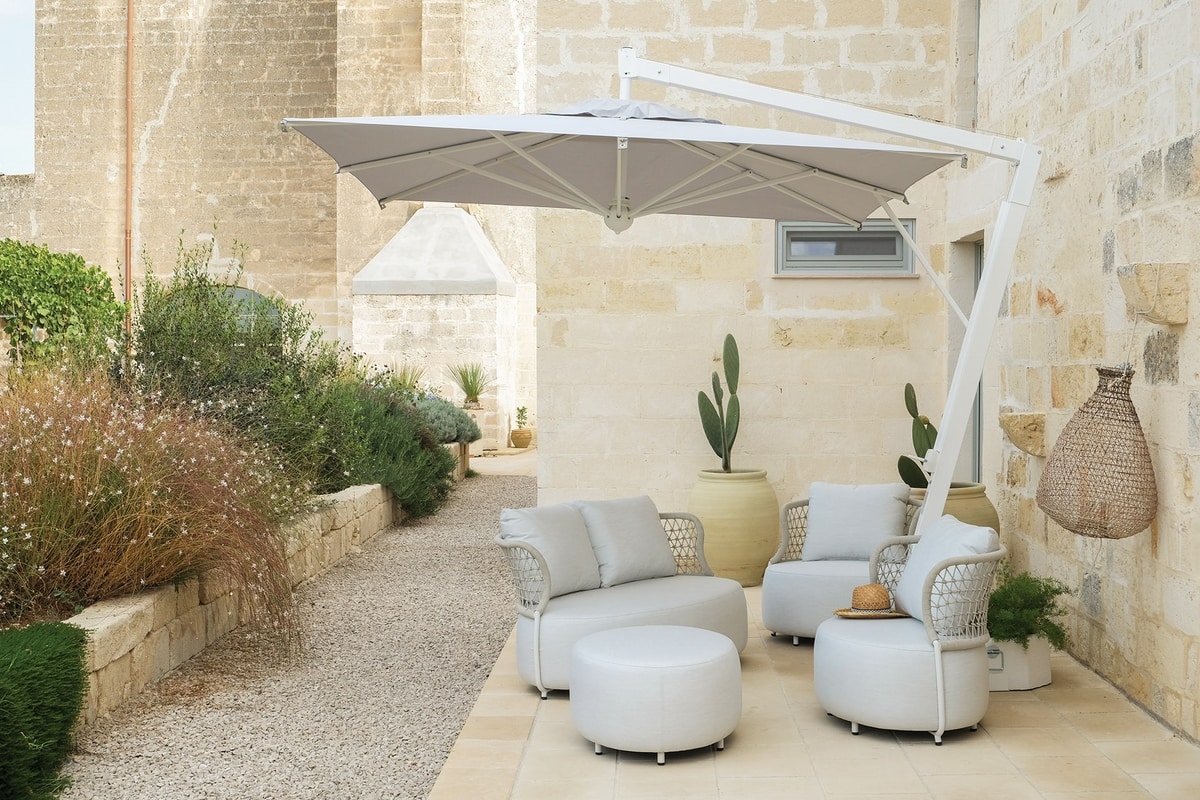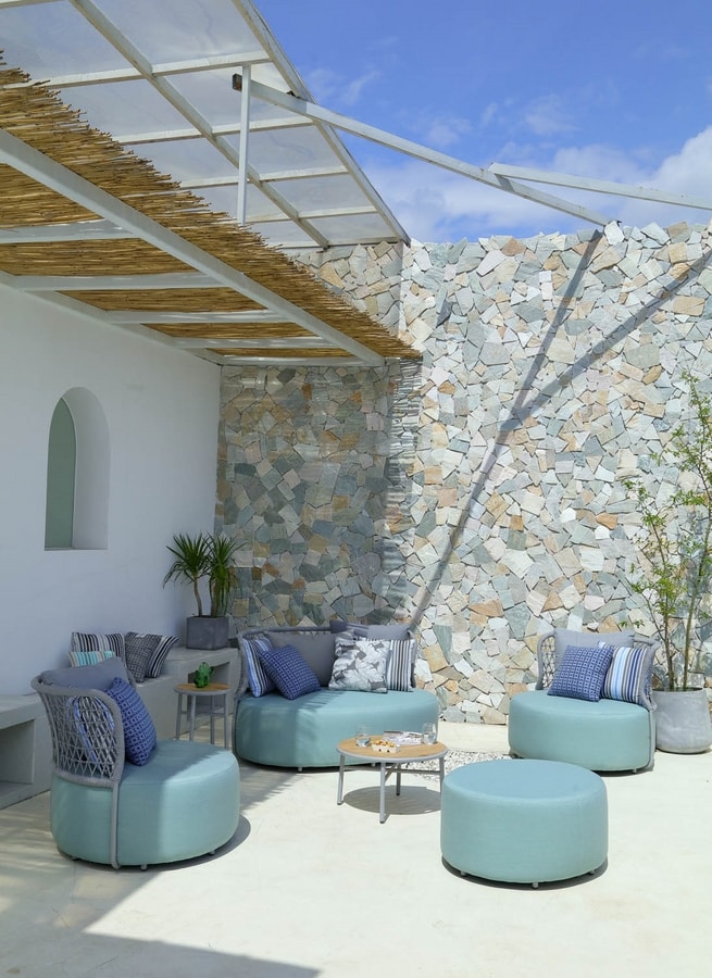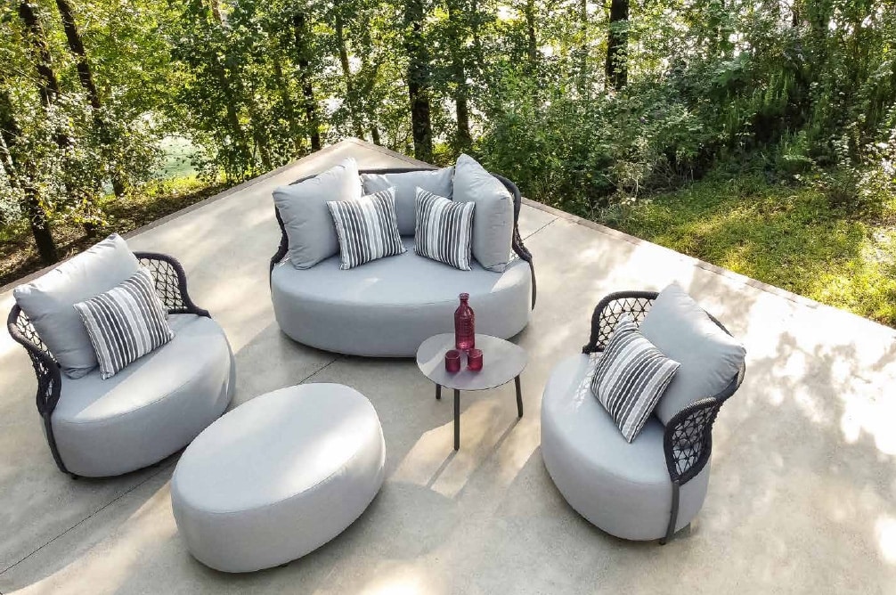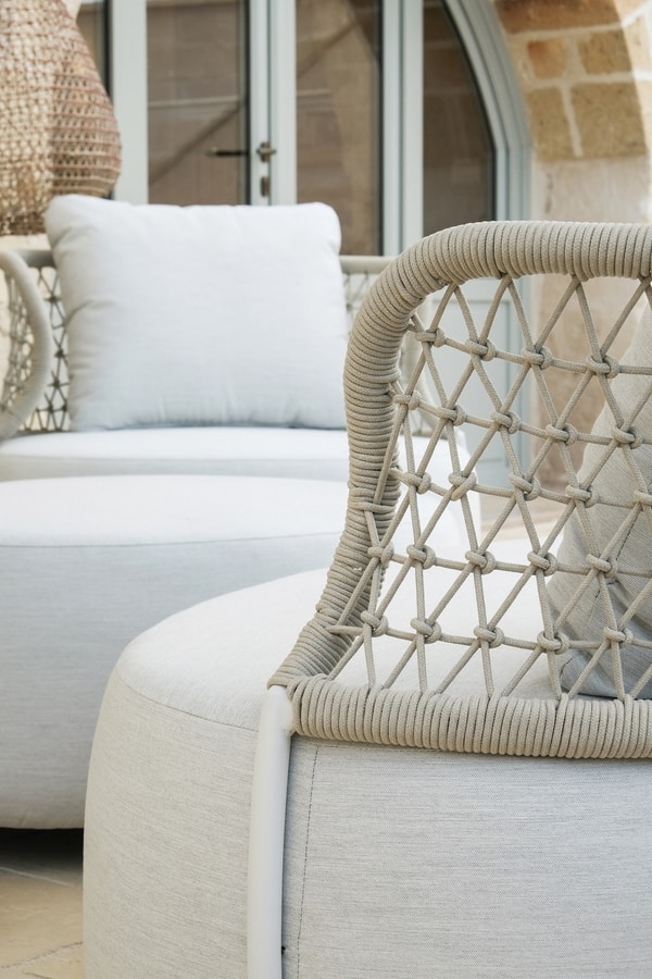 Conjunto de asientos de exterior con estructura de aluminio pintado en polvo. Estructura impermeable y resistente a la luz solar (UV). Cuerda redonda olefina 6 mm. Cojín de asiento de tejido impermeable axroma. Cojín de respaldo tejido impermeable axroma.