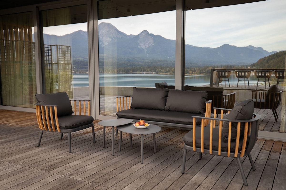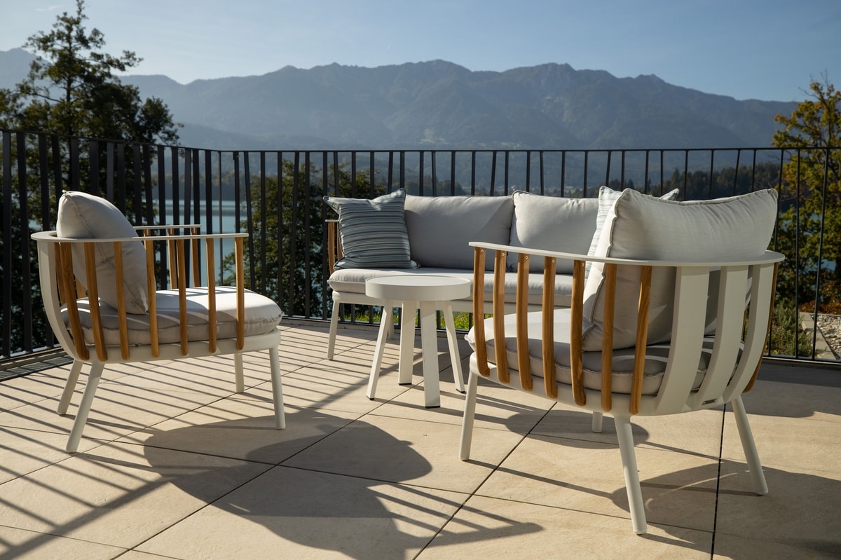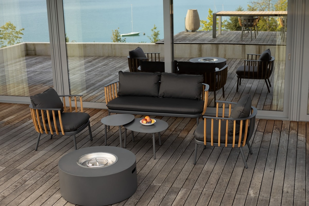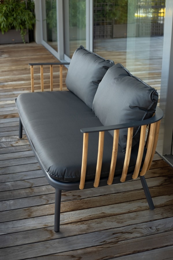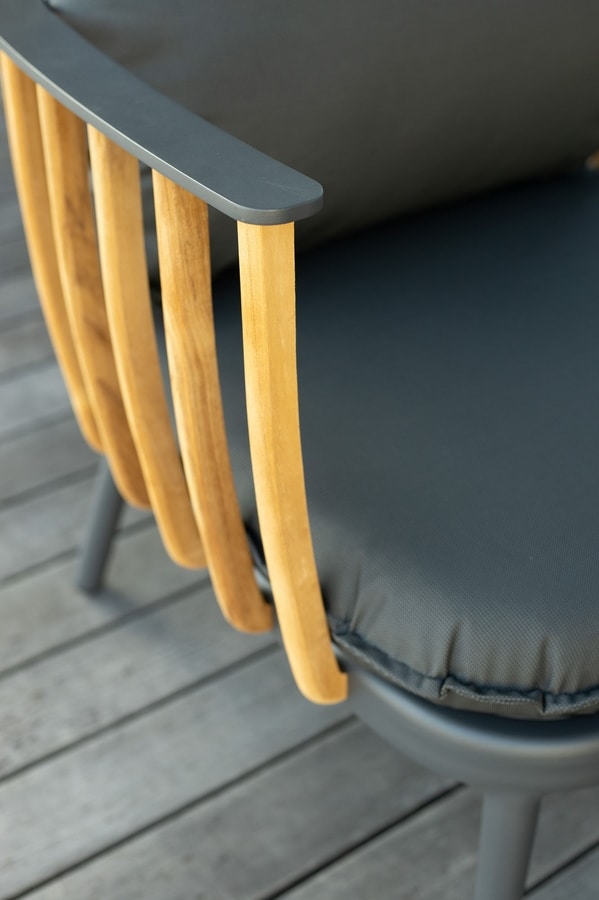 Conjunto de exterior que incluía un sofá y dos sillones. Estructura de aluminio con recubrimiento en polvo, elemento en teca fsc, resistente a la intemperie y a la luz solar (UV), cojín de 5 cm en tela pengi outdoor, espuma de secado rápido de densidad 30.