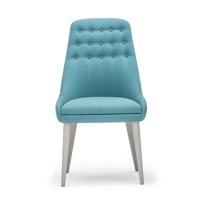Silla con respaldo alto, carcasa de madera contrachapada. Asiento desmontable. Tapizado en el marco. Madera maciza de haya y fresno. Frente trasero con tapizado capitoné. 4 patas torneadas de madera maciza.
