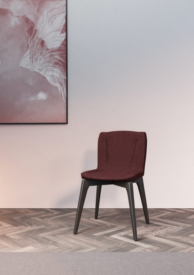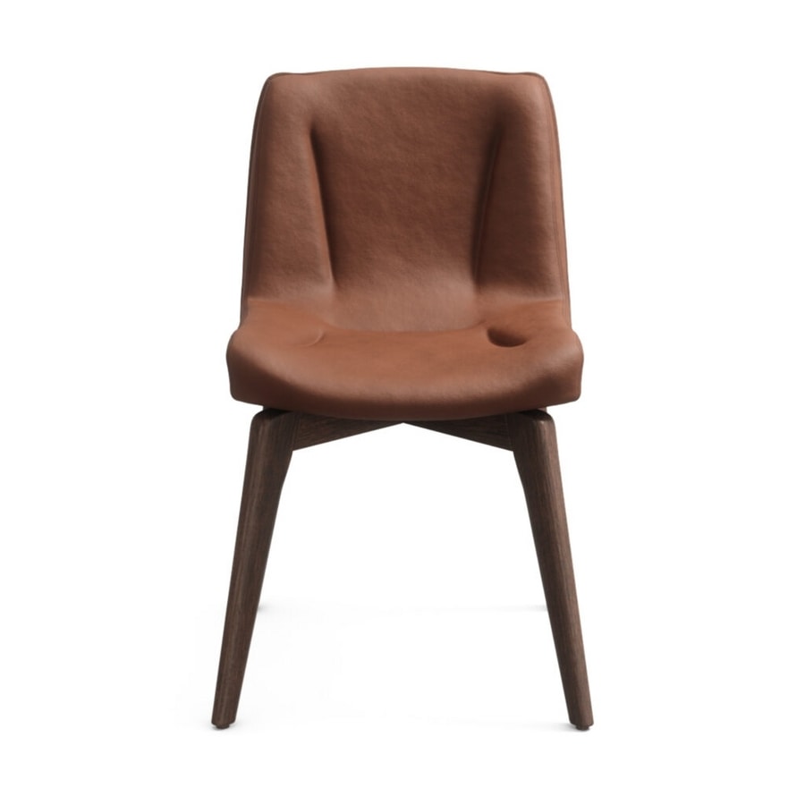 Silla compuesta por una carcasa de madera cubierta con goma suave y patas de madera.