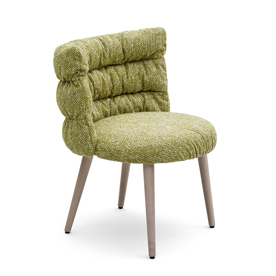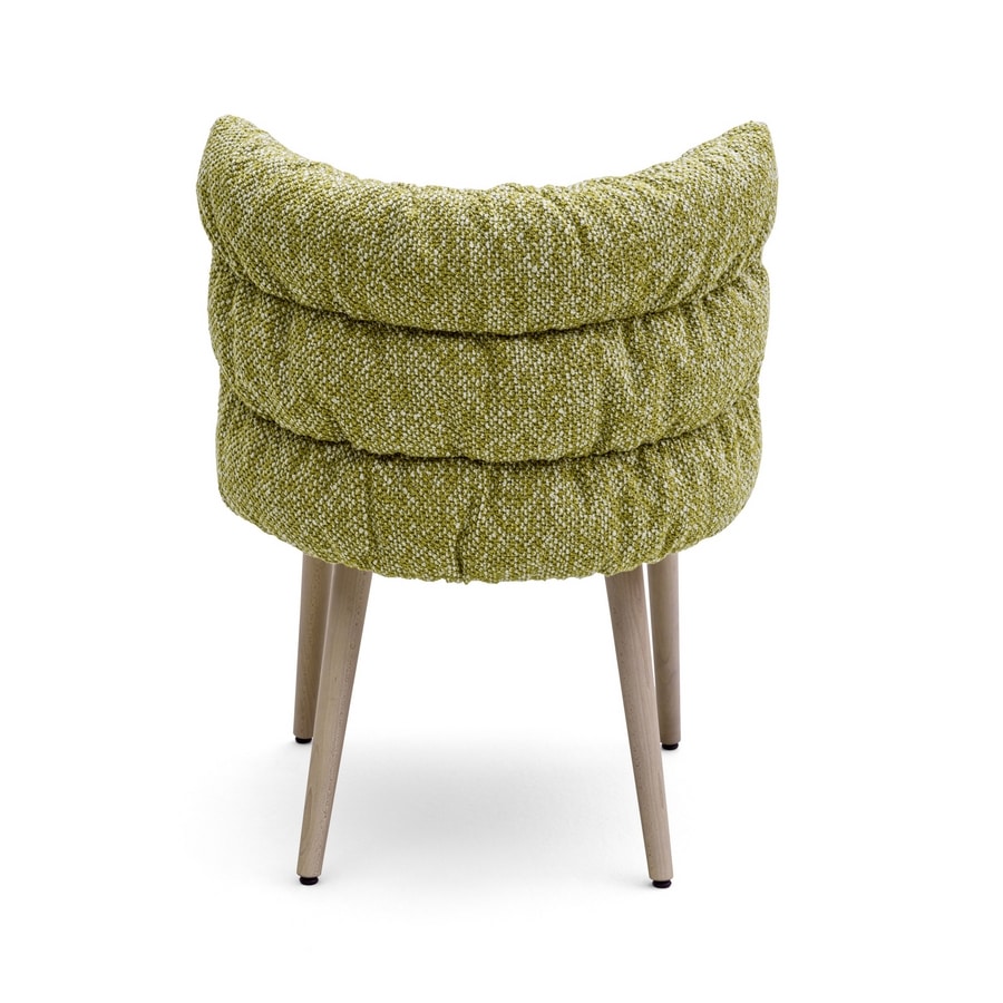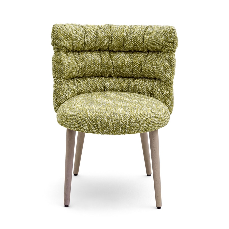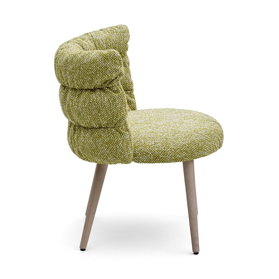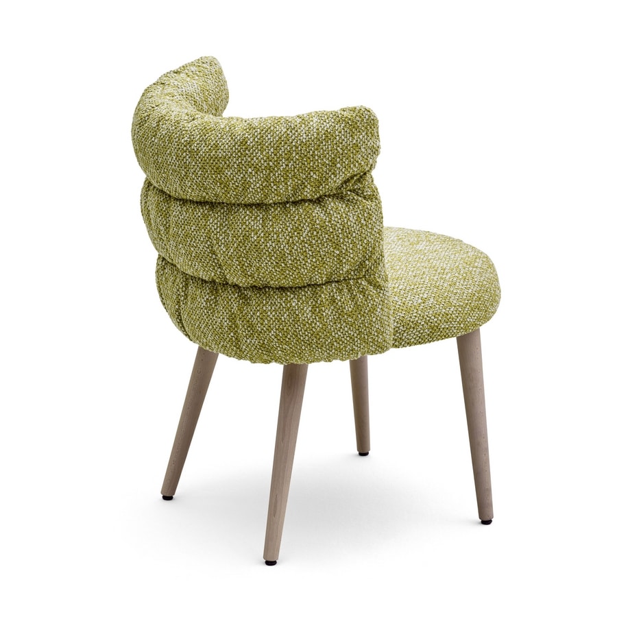 Silla con capatra de madera contrachapada, piernas con perfil redondo en madera de haya sólida, tapizado en el marco con relleno de plumas sintéticas. Asiento en diferentes espumas de densidad.