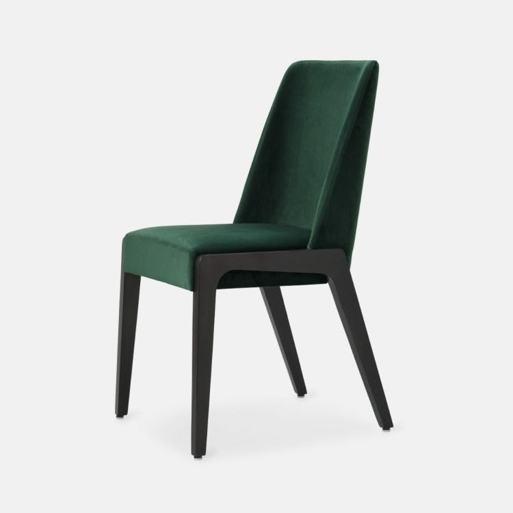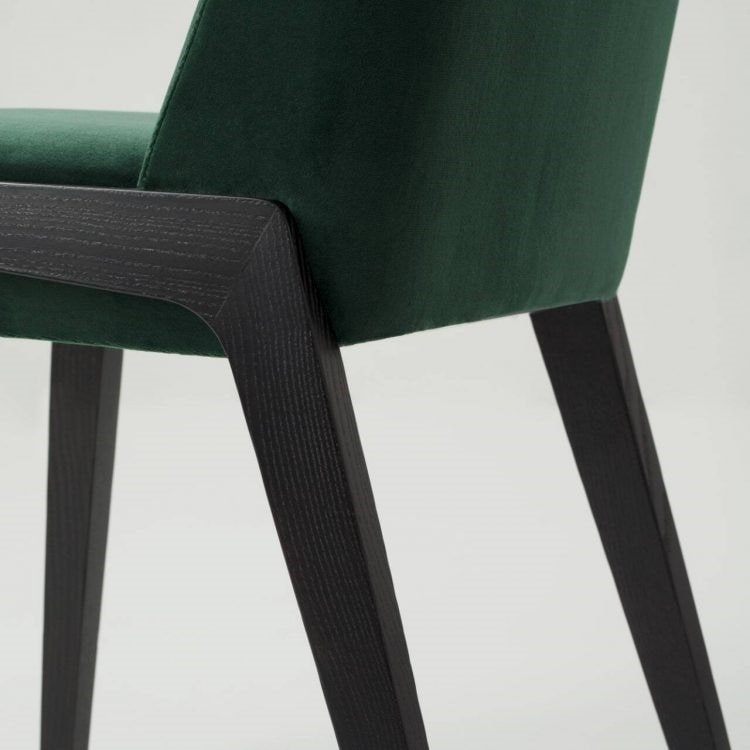 Madera oscura, verde oscuro. La silla de la colección Musa reinterpreta las formas tradicionales con elegantes combinaciones, un original diseño de las patas y una gran solidez general.