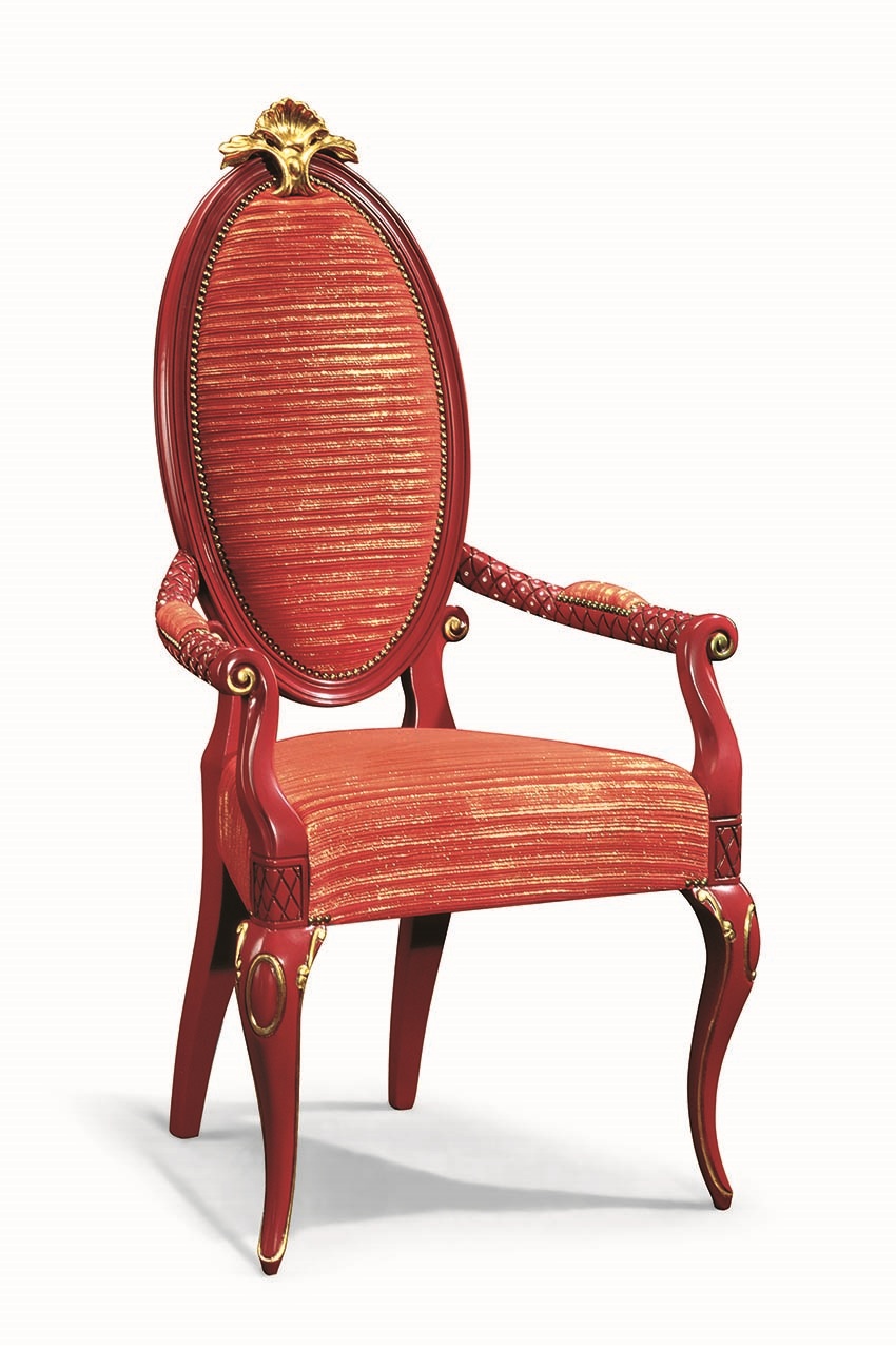 Sillón lacado en madera maciza, con asiento y respaldo tapizados con clavos, respaldo ovalado y decoraciones de hoja dorada.