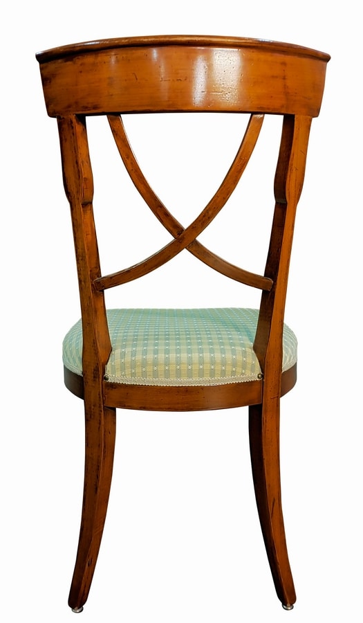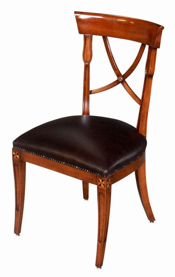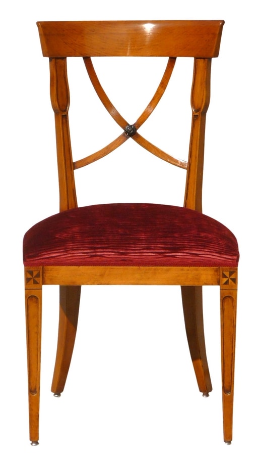 Silla de cerezo Luis XVI. Respaldo arqueado calado con apoyo en forma de X, asiento acolchado y patas curvas con incrustación de estrella policromada en el hombro.