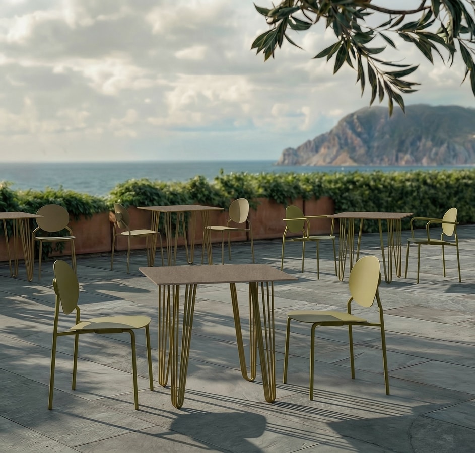 Silla con reposabrazos, fabricada en acero galvanizado con acabado pintado para exterior, disponible en diez colores estándar diferentes.