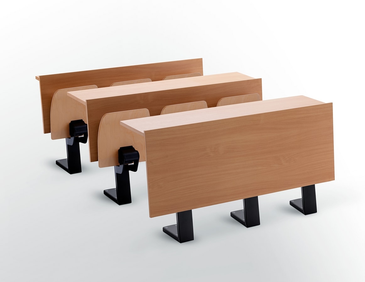 Asiento y respaldo en contrachapado de haya barnizado o acolchado y tapizado (tela o ecopiel). Estructura de soporte pintada RAL 9006, mecanismo basculante del asiento pintado RAL 9006 con muelle de retorno interno. Soporte central y pie de fijación para cada asiento. Fijación al suelo sin tornillos visibles Superficie de escritura fija o antipánico, en material de madera revestida de melamina.