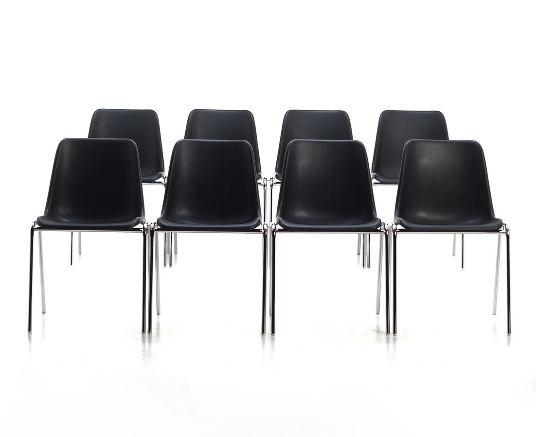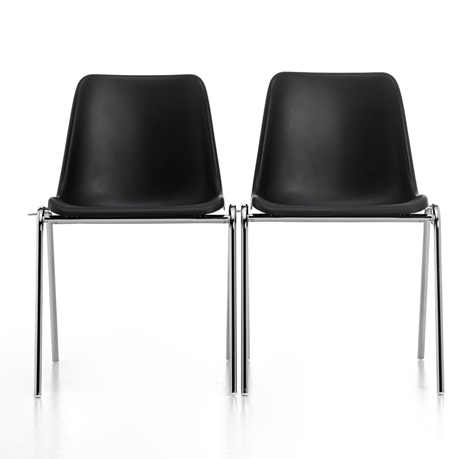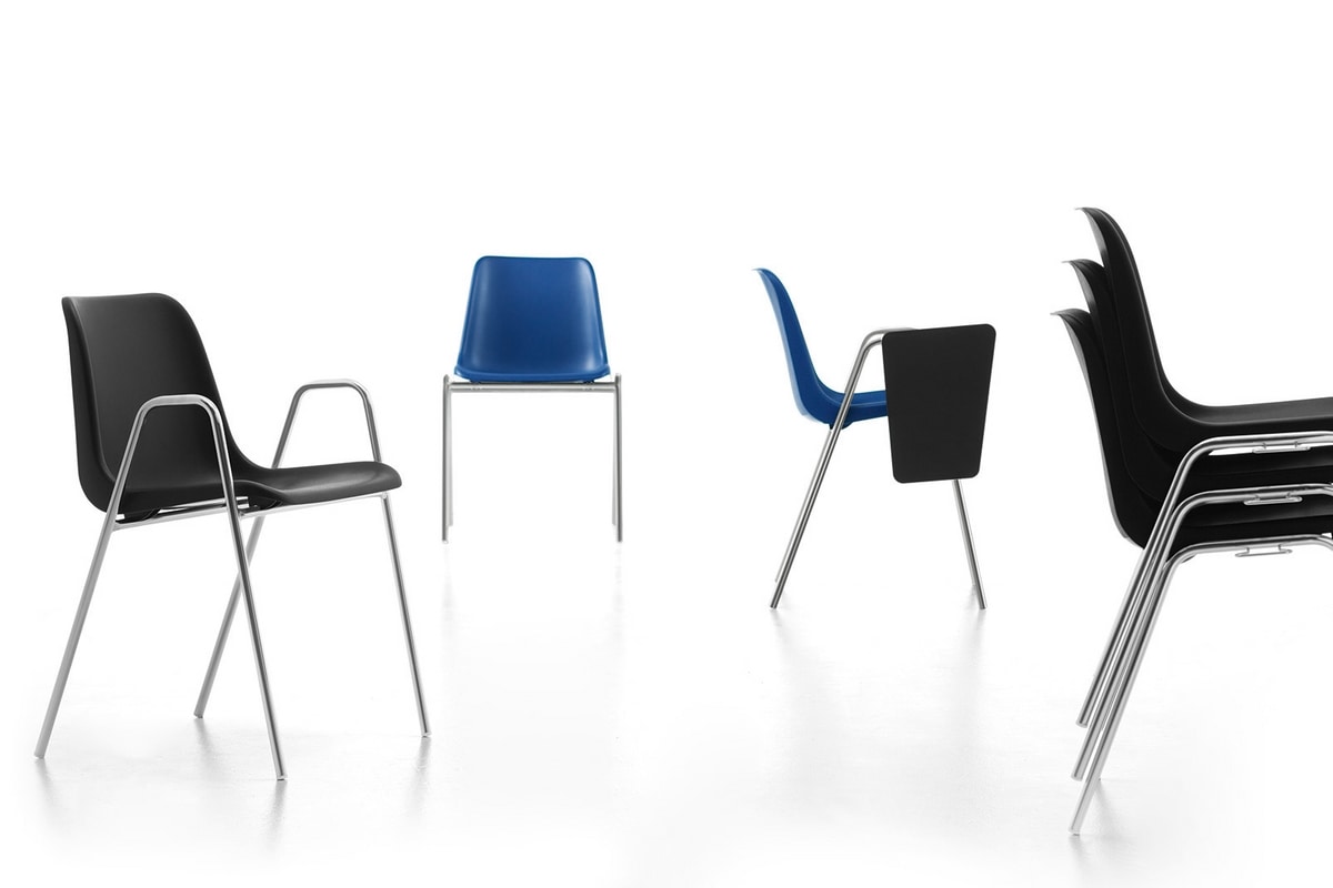 Un verdadero icono entre los presidentes comunitarios. Silla ergonómica y de un solo bastidor en material plástico, con marco de acero, pulido o negro. Esta silla viene con y sin reposabrazos y está equipada con un bloc de notas, lo que la hace perfecta para salas de entrenamiento o reuniones.