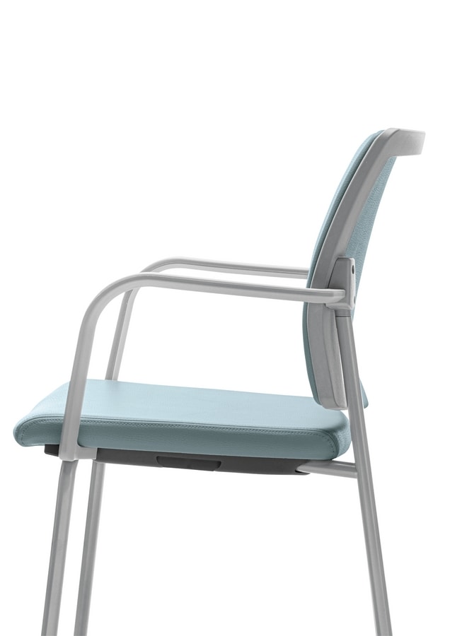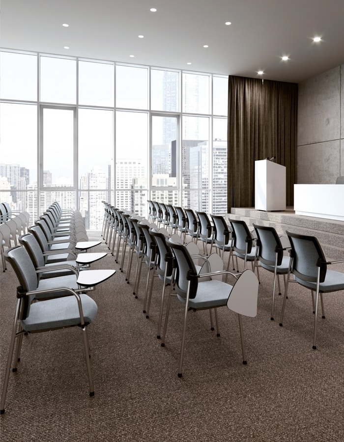 Serie con asiento y respaldo separados. Modelos de 4 patas o patín apilables, con o sin brazos, o con pala de escritura, en versión giratoria o sobre viga. Respaldo tamaño XL.