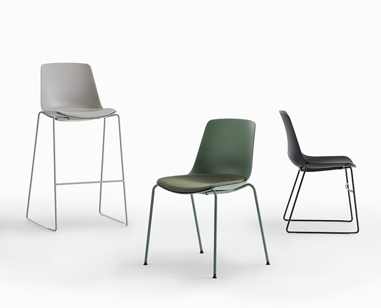 Java es una amplia familia de asientos compuesta por un monocasco de plástico en cuatro colores, a la vista o tapizado de diversas formas, con cuatro tipos de bases que amplían su uso, haciéndola perfecta en entornos laborales, hosteleros y residenciales. La combinación de colores de los bastidores, las estructuras y la tapicería permite infinitas variaciones