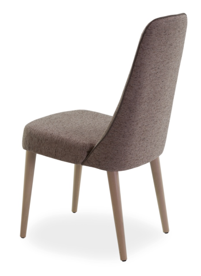 Silla con estructura de madera, asiento y respaldo tapizados en tela o en combinación tela-piel.