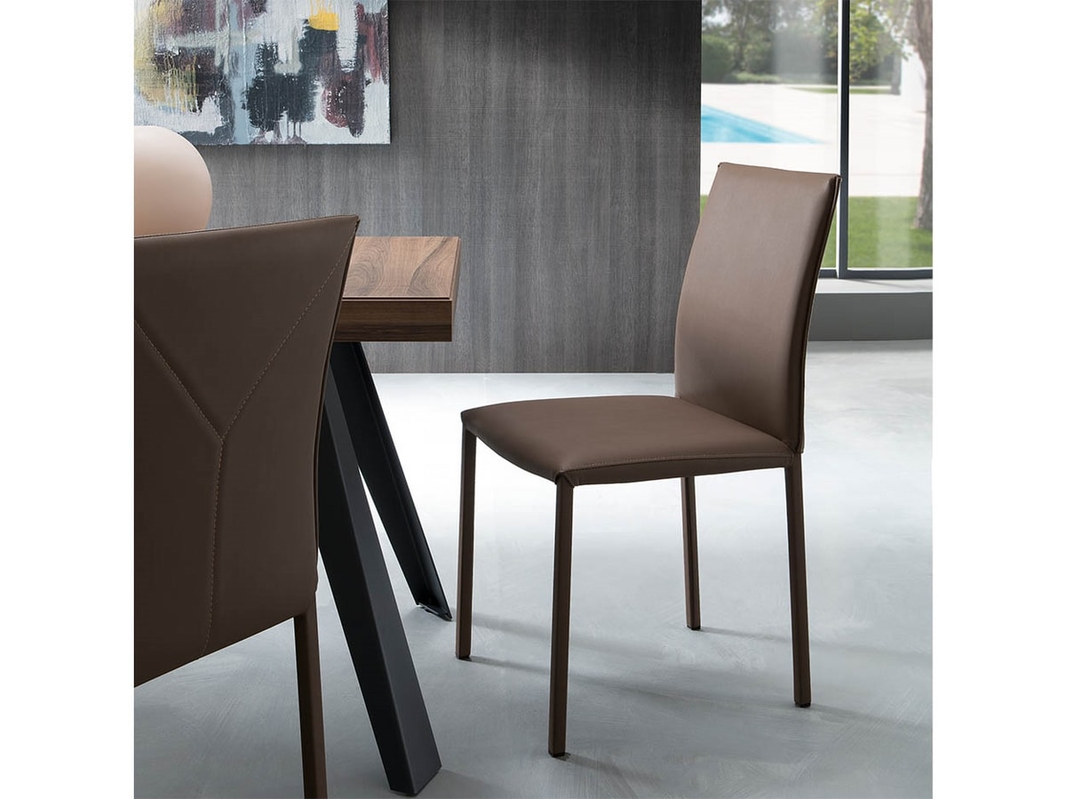 Keira es una silla íntegramente tapizada en ecopiel o terciopelo, de diseño moderno con formas estrictas y cuadradas. La perfección geométrica se extiende hasta el respaldo, mostrando un elegante patrón con puntadas en contraste, resultado de una meticulosa artesanía. El uso de materiales de alta calidad para la tapicería garantiza una experiencia de asiento confortable y confiere a la silla un encanto sensorial distintivo. Keira es adecuada para cualquier salón o cocina contemporánea.