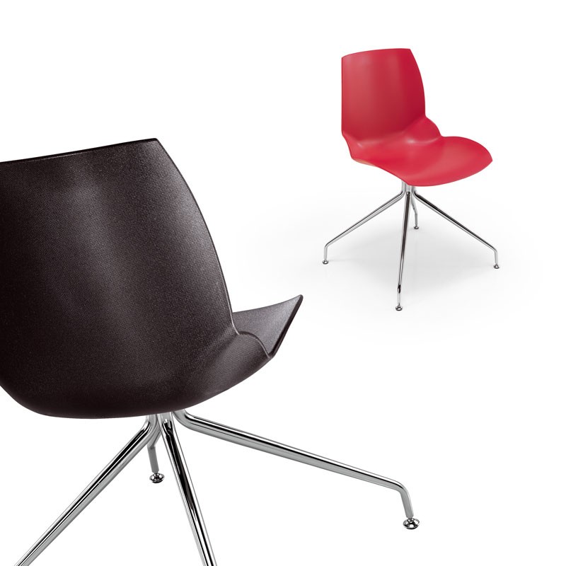 Kaleidos tiene una línea pura, enriquecida por el especialísimo acabado superficial del bastidor que le proporciona efectos ópticos tridimensionales y reflejos sorprendentes; además, su particular textura ofrece un inédito placer al tacto. Para el bastidor, constituido por una pieza única, se ha elegido un tecnopolímero reciclable. Las estructuras portantes de acero están disponibles en diferentes variantes.
