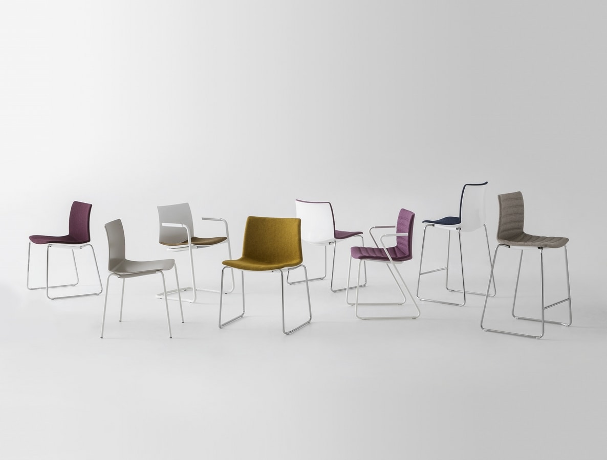 Kanvas 2 completa la colección de asientos y taburetes con un sistema versátil y personalizable. Su diseño se adapta a espacios flexibles y multifuncionales. Acero, madera, tecnopolímero, aluminio y revestimientos frontales o integrales se combinan para crear ambientes únicos gracias a la creatividad de los diseñadores.