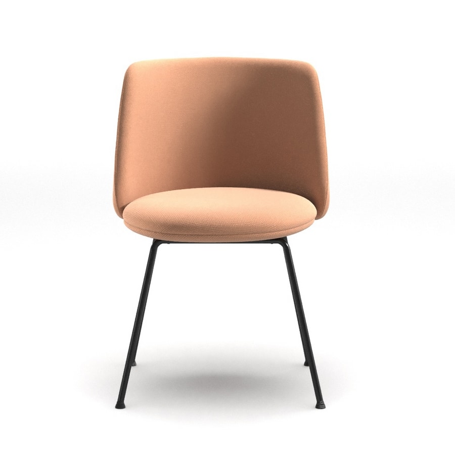 Silla de 4 patas con estructura de acero cromado o pintado, asiento y respaldo de contrachapado de haya con acolchado de espuma ignífuga y tapizado.