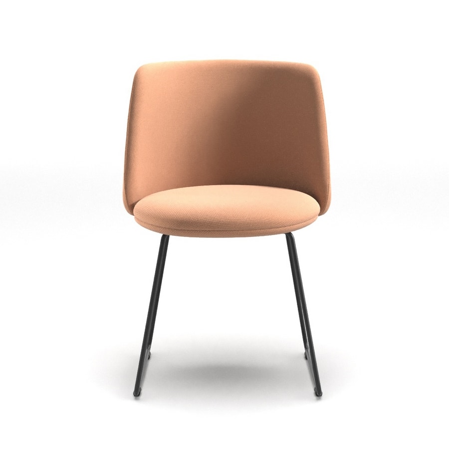 Silla con estructura tipo trineo en acero, asiento y respaldo de contrachapado de haya con acolchado de espuma ignífuga y tapizado.