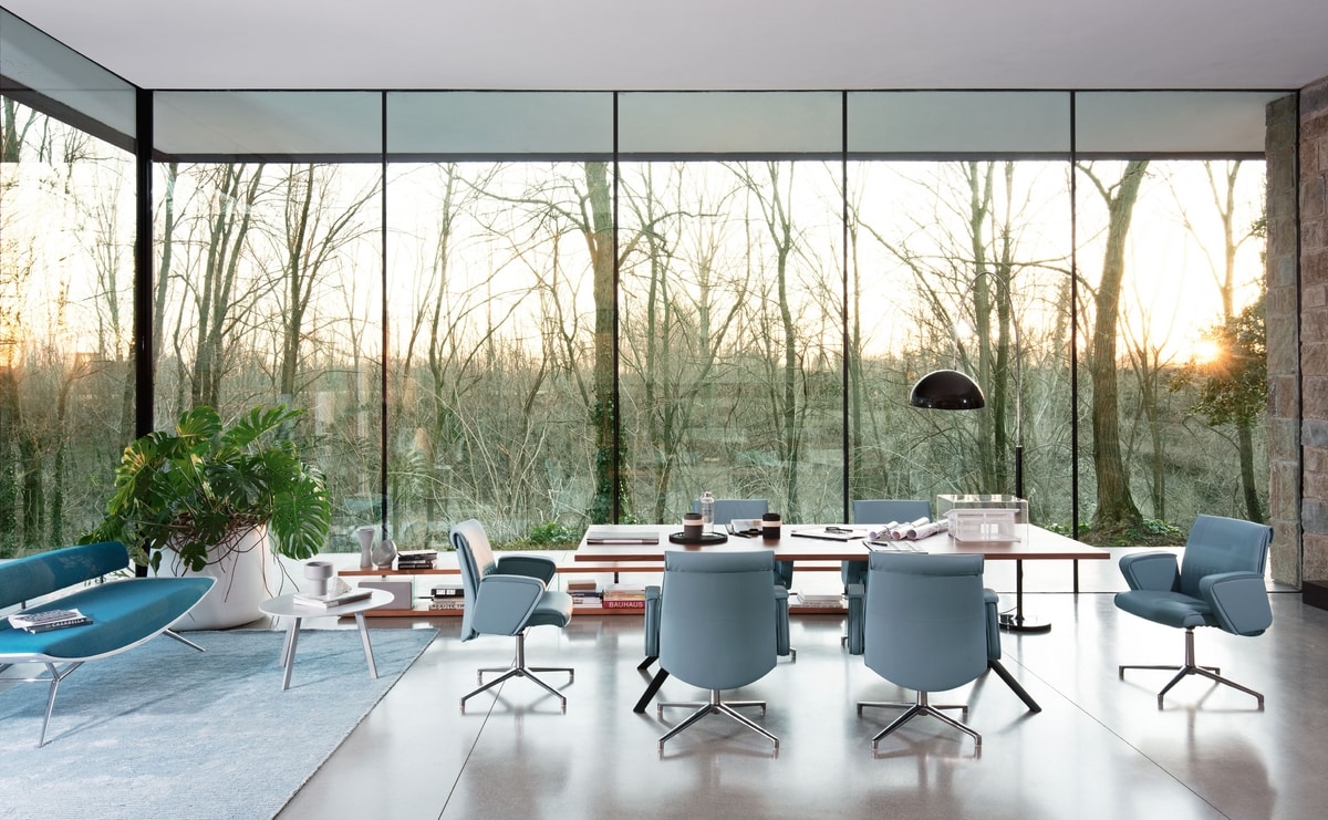 Los apoyabrazos, abiertos o cerrados, están elegantemente terminados con puntadas que recuerdan las costuras del respaldo.